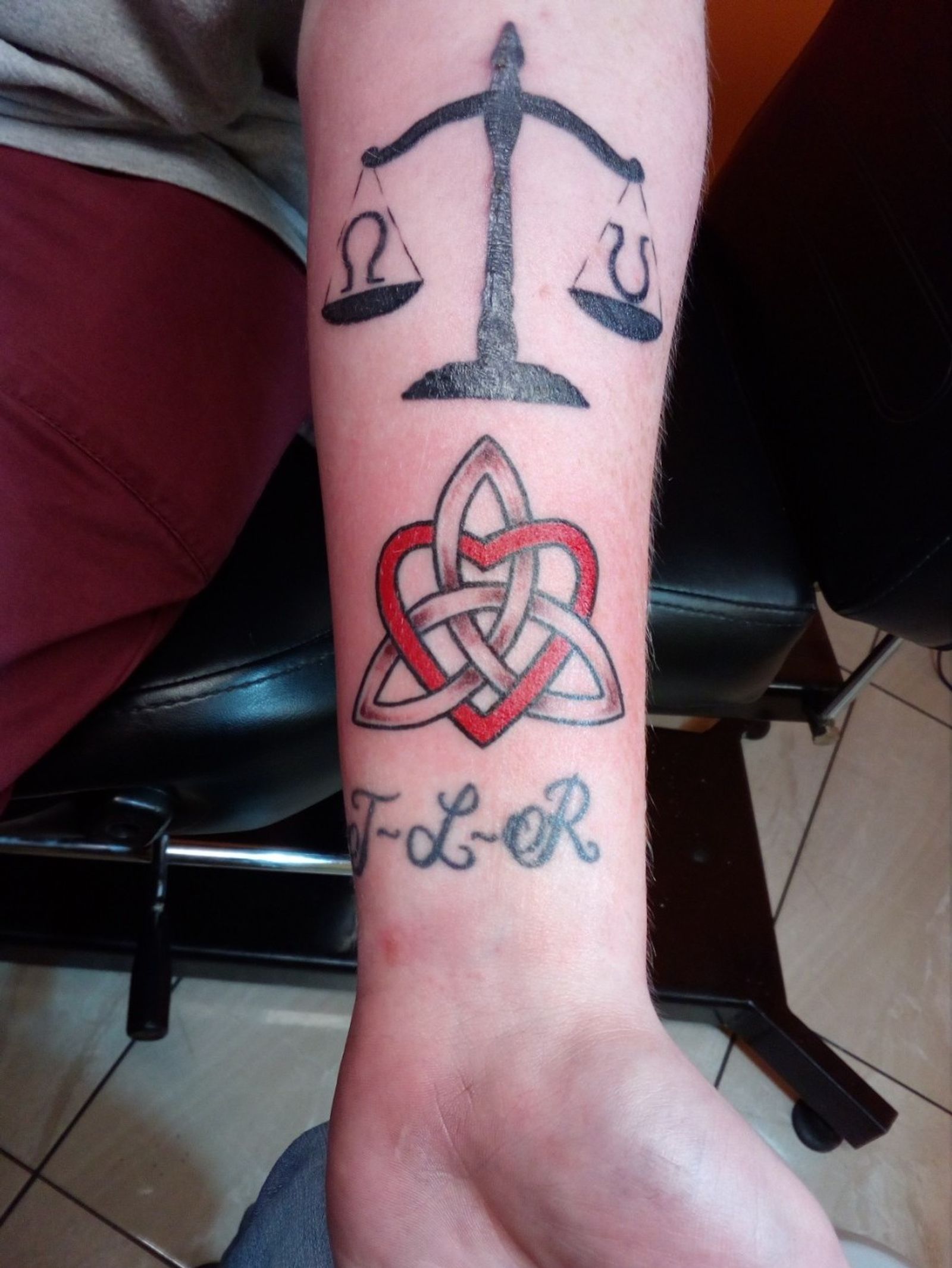 TLR = Trust Loyalty Respect Celtic sign with a heart Scales of justice with life and death symbols