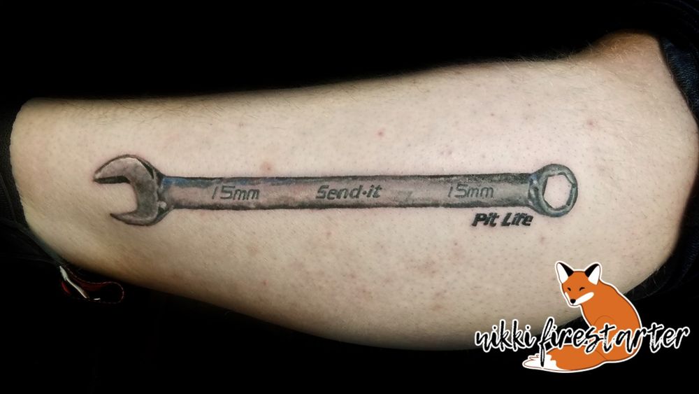 "Send-it" - life size wrench on a calf, done during my apprenticeship (July 2018). http://nikkifirestarter.com #tattoo #bodyart #bodymod #ink #art #femaleartist #femaletattooist #apprenticetattoo #mnartist #mntattoo #mntattooist #visualart #tattooart #tattoodesign #wrench #sendit #wrenchtattoo #pitlife #sendittattoo #tools #tooltattoo #15mm #legtattoo #calftattoo