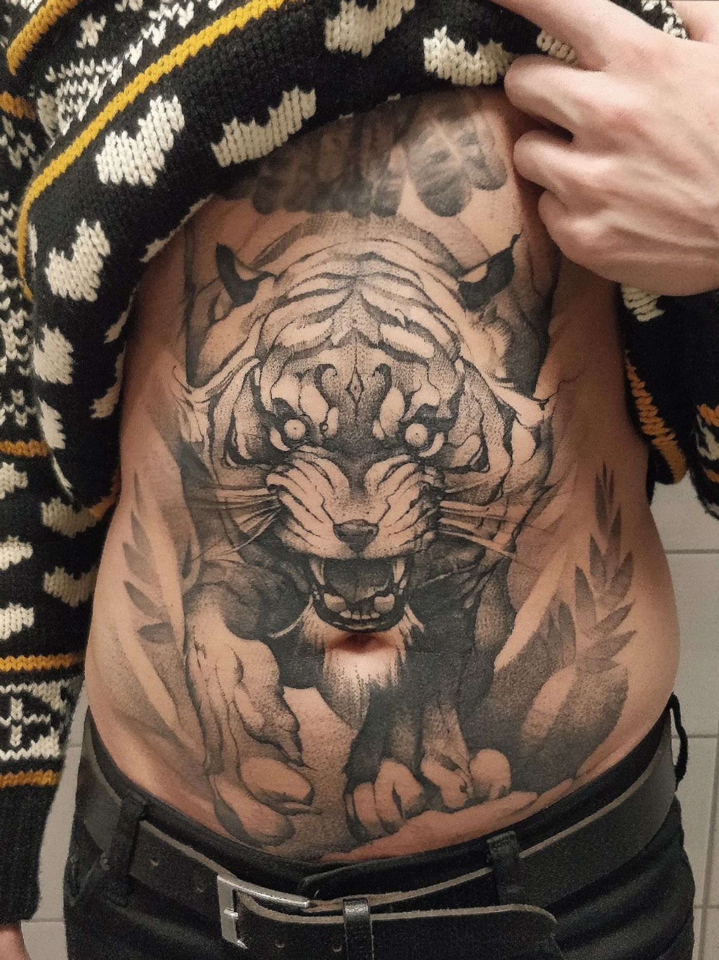 #tiger #tigertattoo #stomach #stomachtattoo #dotwork #blackandgrey #blackwork