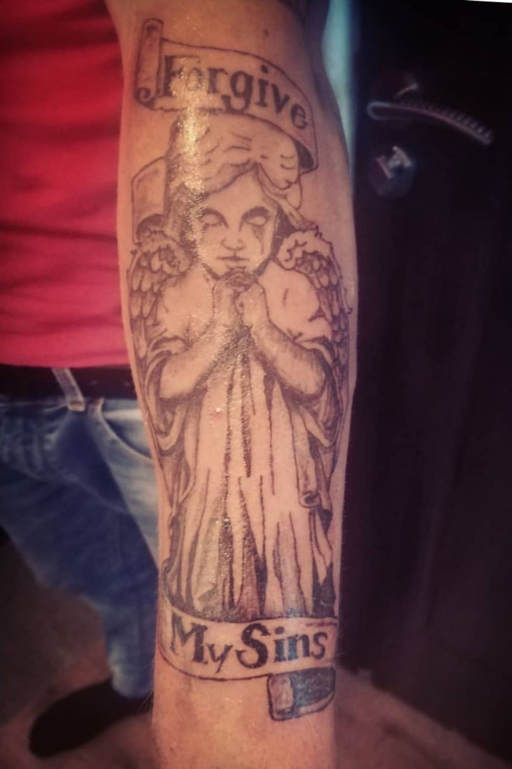 #AngelTattooArtOnSkin #statuetattoos #wingstattoo #prayinghands #forgive #sins