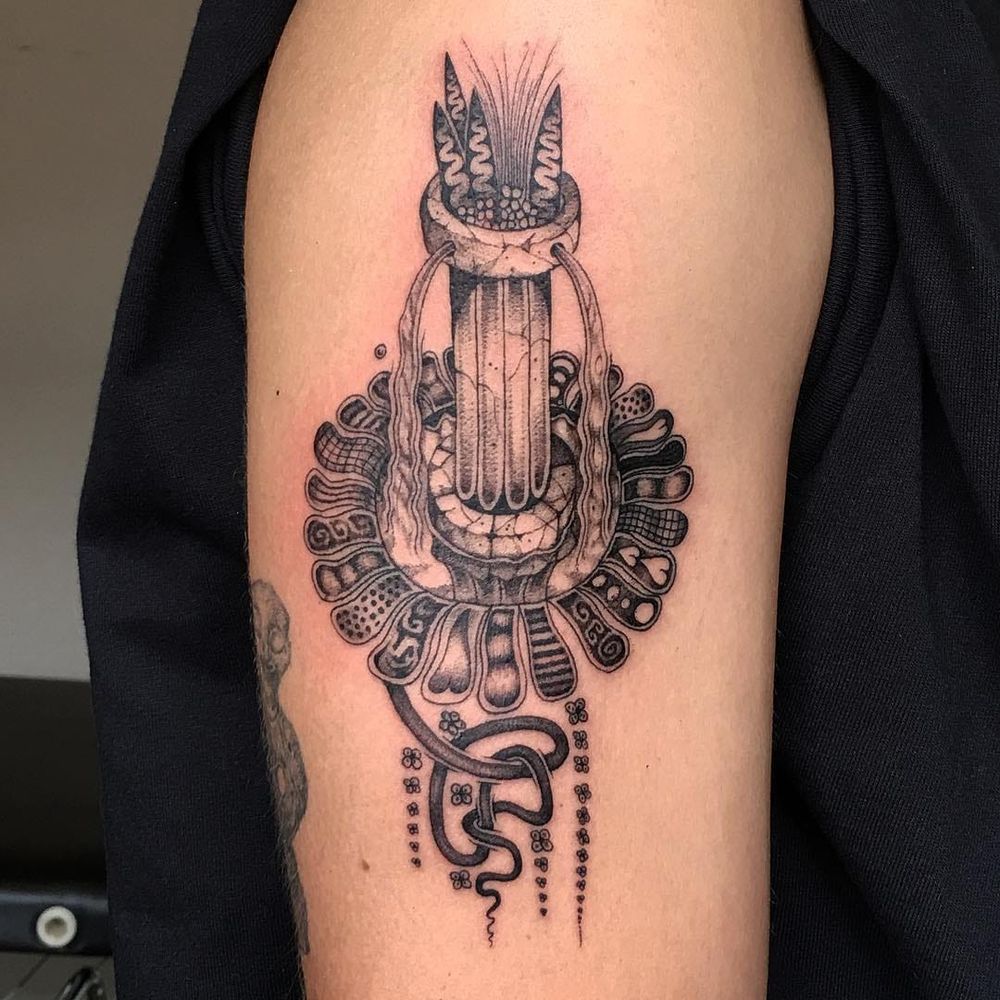 Tattoo by Carson Flowie #CarsonFlowie #abstracttattoos #abstracttattoo #abstract #shapes #surreal #strange #illustrative #fountain #strange