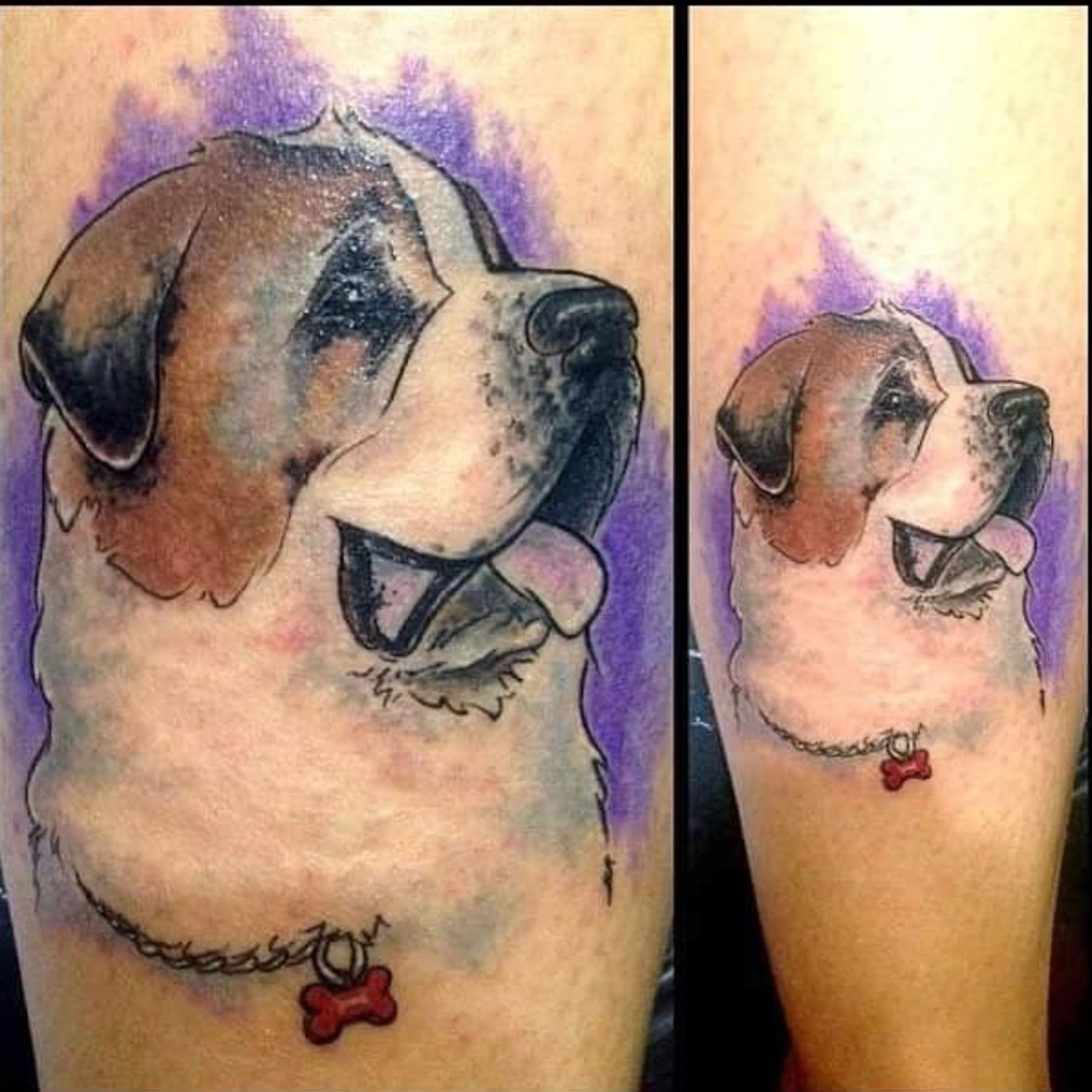 Tattoo by @Samfarfan (+34684178546) #puppytattoo #puppyportrait #dogportrait #dogtattoo #colortattoo #color #pettattoos #perros #dog #animal #nature #colors #morado #fineline #tattooartist