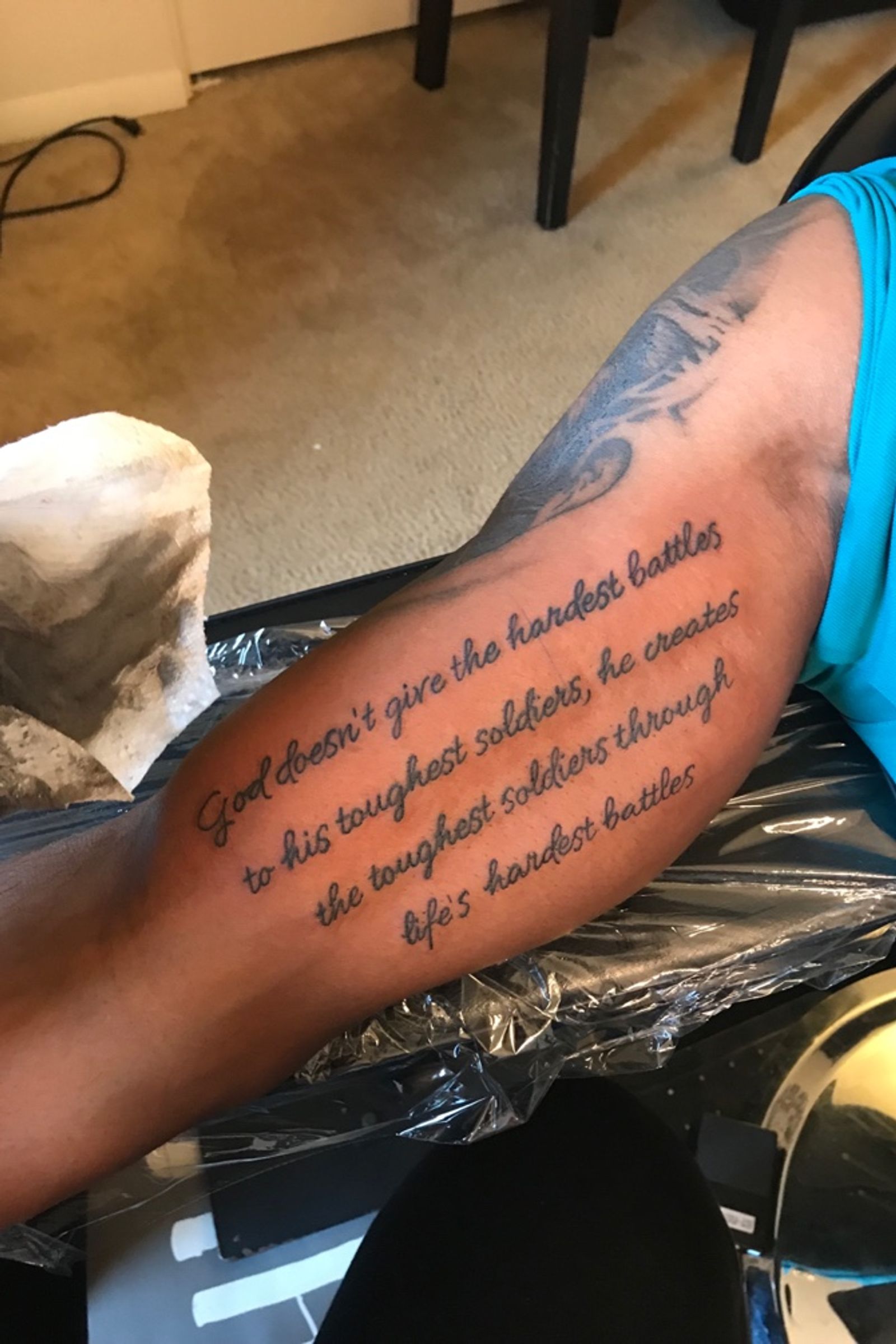 Bicep tattoo #strength #god #religion #religioustattoo #catholic #christian #prayer #life #cursive #cursivetattoo