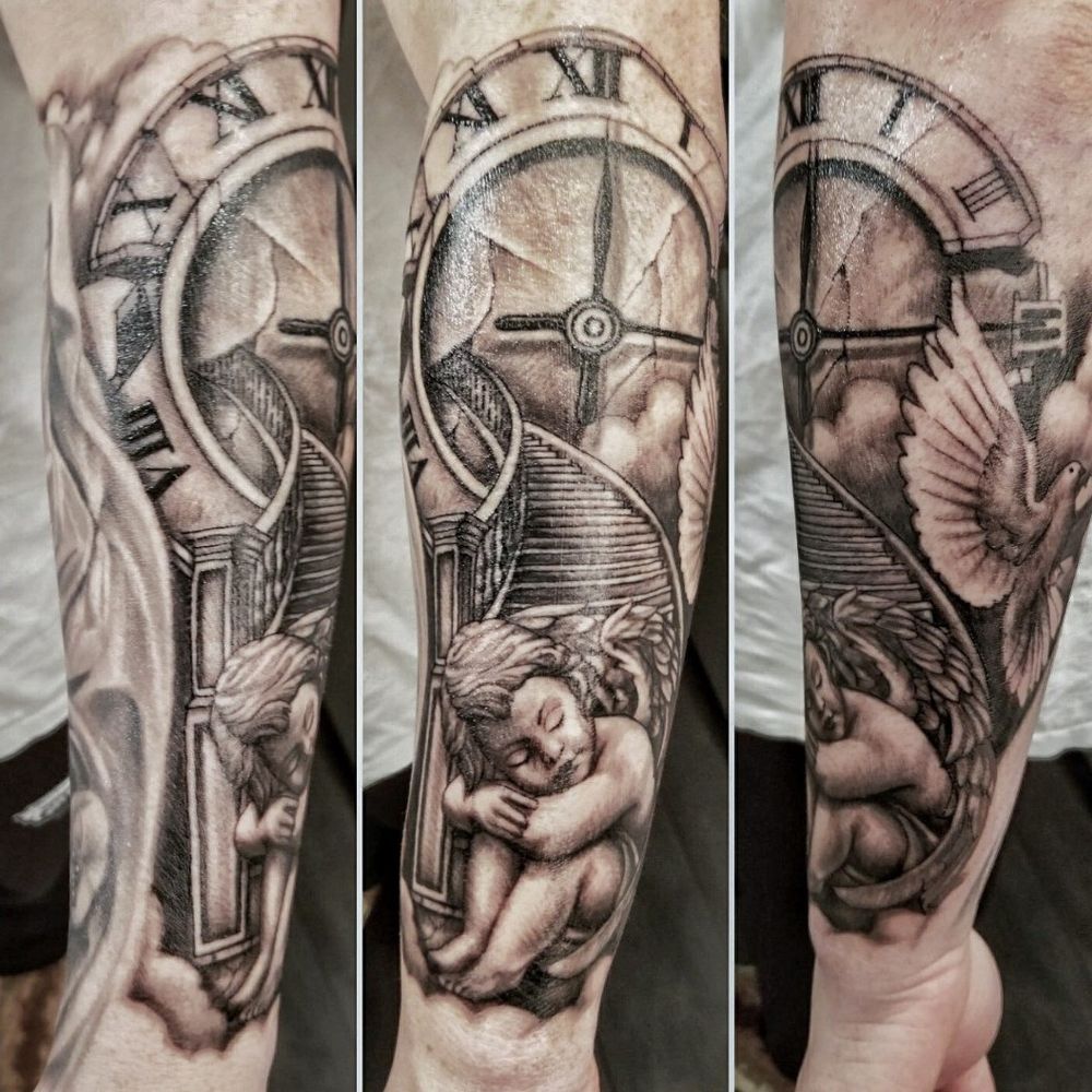 Baby jesus (angel) stairs clock tattoo