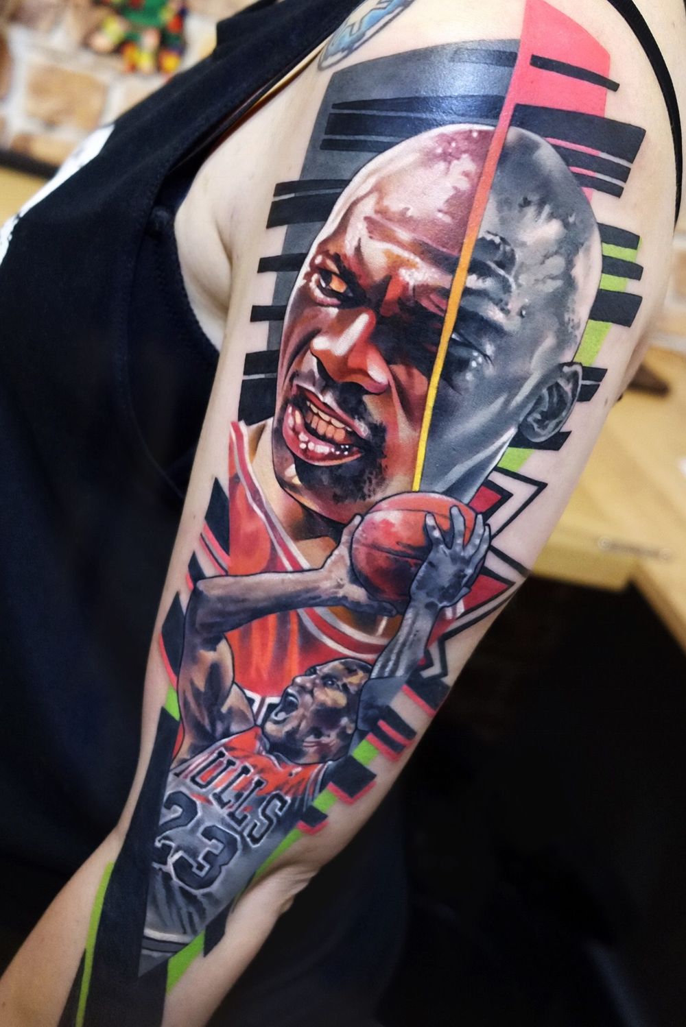 Michael Jordan , una sorpresa muy agradable para mi cuando Gema me encargo un diseño de Jordan, en el que tenia que notarae una estética ochentera, por eso decidi introducir ese dondo rosa y verde fluor! Sin duda uno de esos tattoos que me haria a mi mismo si pudiese. #basket #nba #Jordan #michaeljordan #tattoooftheday