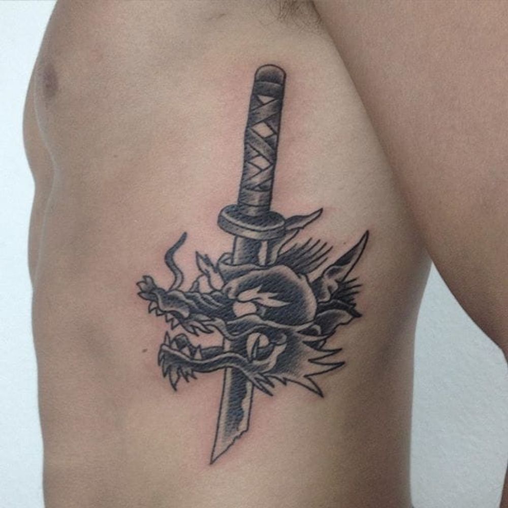 Dragon head with the half Katana by Leandro Galvan #katanatattoo #dragon #leandrogalvan
