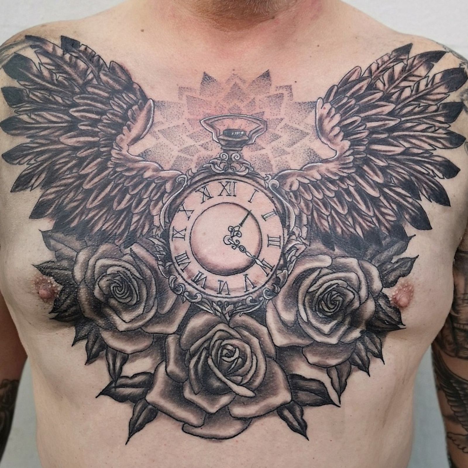 Pocketwatch wing custom piece #pocketwatchtattoo #pocketwatch #wings #wing #rose #rosetattoo #dotworktattoo #dotwork #mandalatattoo #mandala #hastings #uk #chestpiece #customtattoo