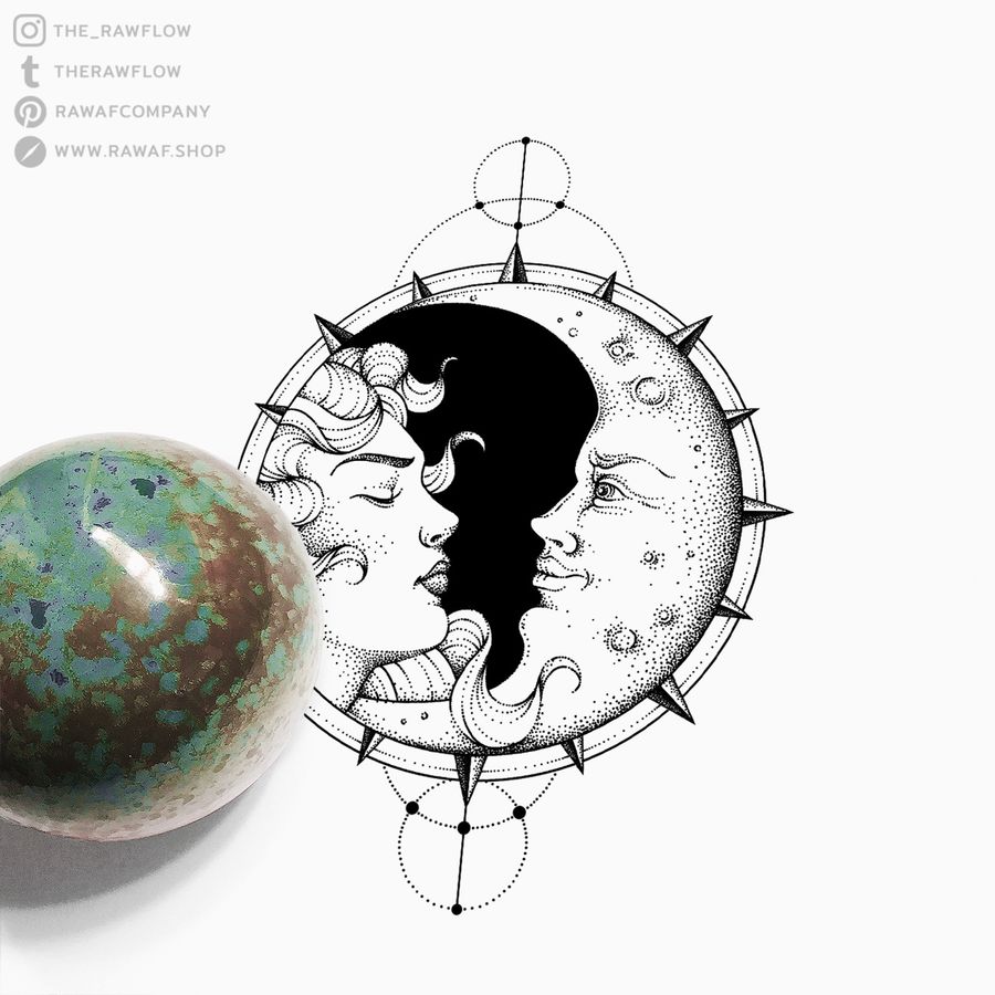Like Sun and Moon. 🖤🔥 Downloads, commissions, temporary tattoos: www.rawaf.shop/tattoo #sun #moon #compass #dotwork #blackwork #portrait #galaxy #love #black #blackandgrey #woman