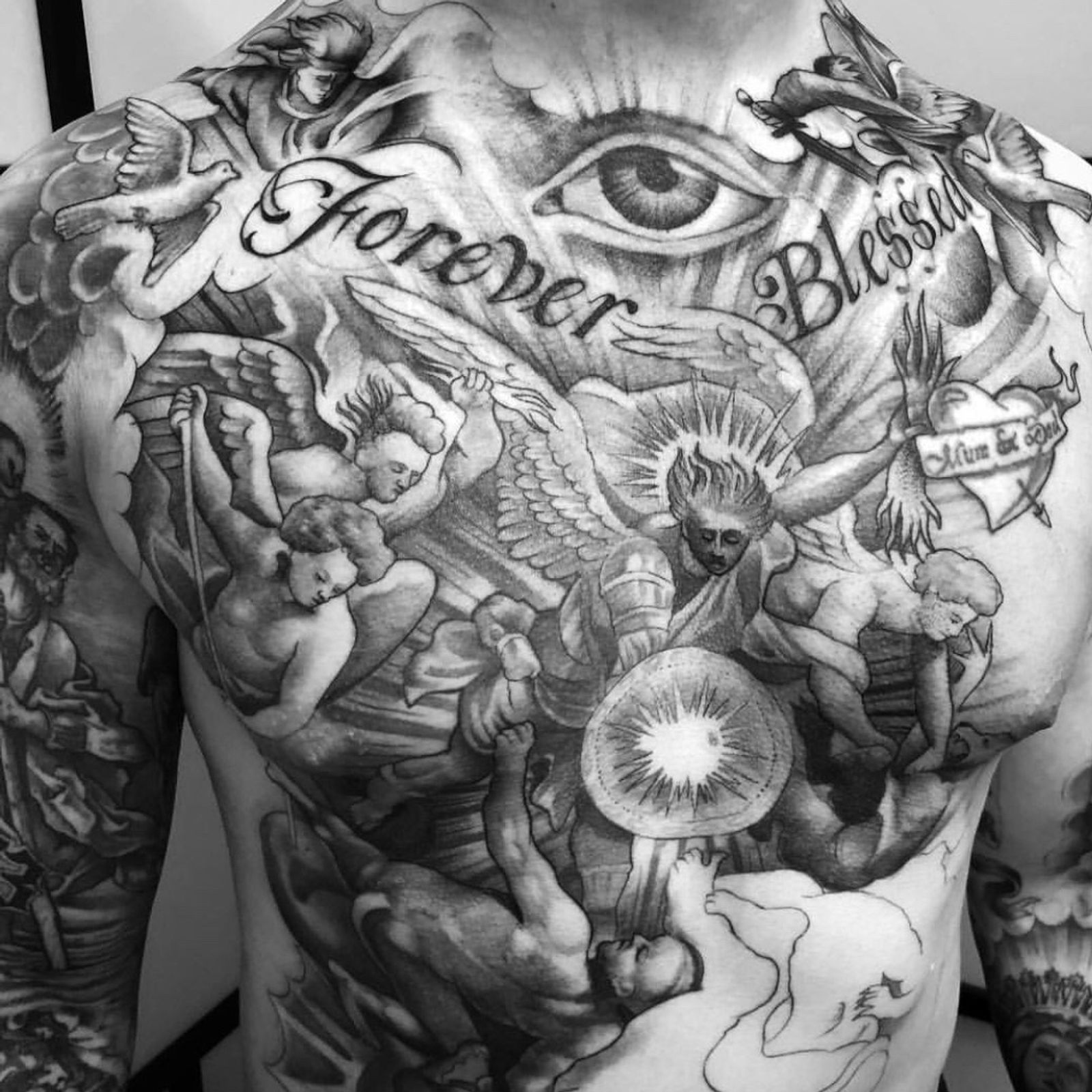 War in Heaven Some on going work on my boy Jim #chesttattoo #chestpiece #blackandgrey #blackandgreytattoo