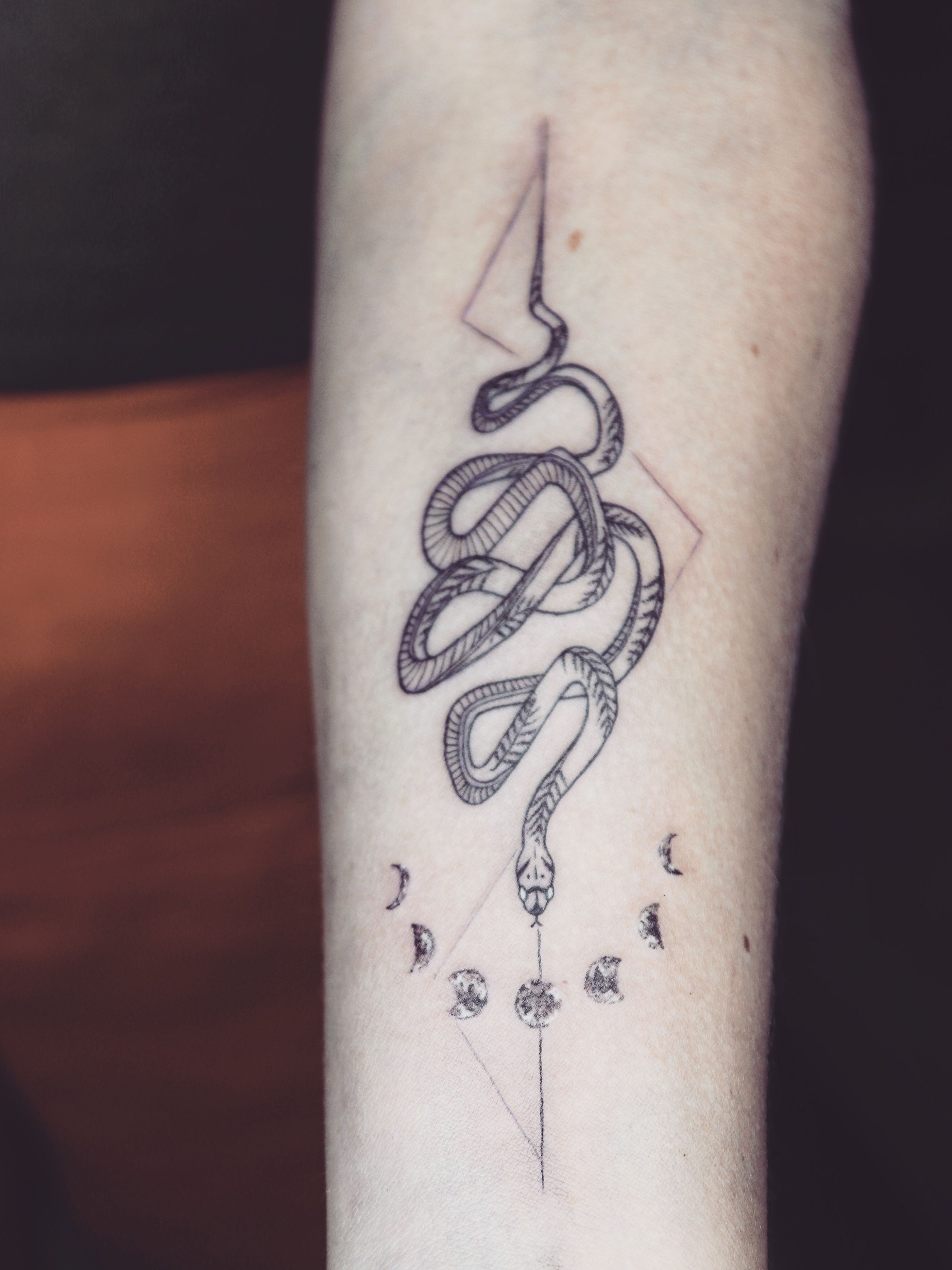 Fine line snake tattoo - Tattoo Chiang Mai #snake #snaketattoo #linework #lines #leaves #fineline #geometric #moon #Black #simple #ChiangMai #thailand #tattoochiangmai #tattooartistchiangmai #instatattoo #inkstinctsubmission #inked #inkstagram