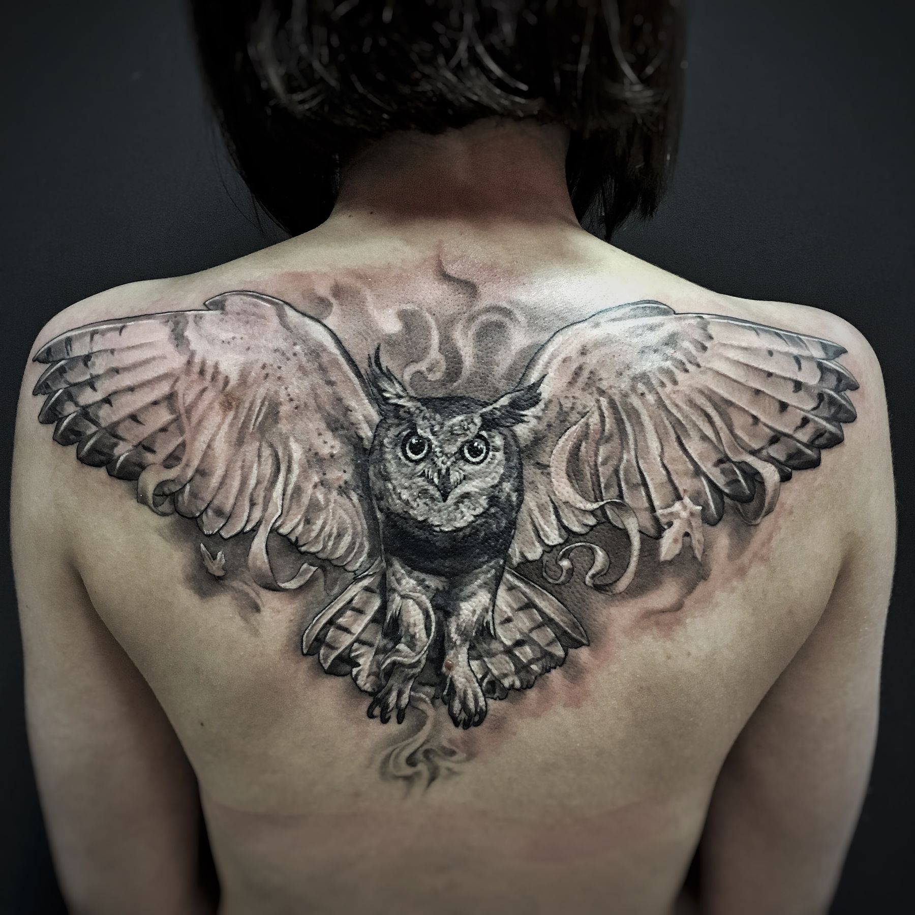 #owl #owltattoo #animal #wings #back #bigtattoo #realistic #realism #blackandgrey #madmamont