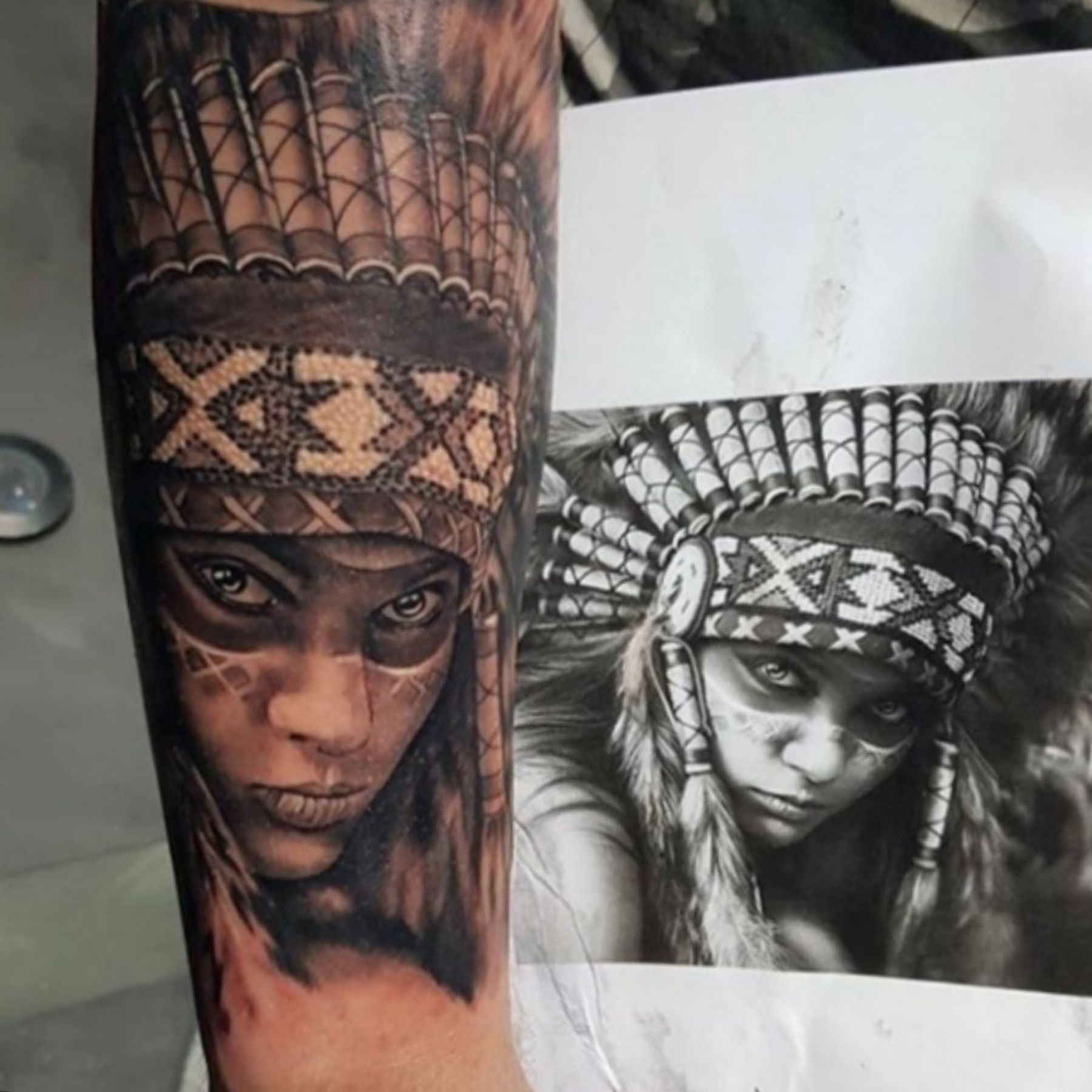 #indiangirl #nativeamericantattoo #blackandgreytattoo #blackandgrey #headress #feathertattoo #realism #realistic