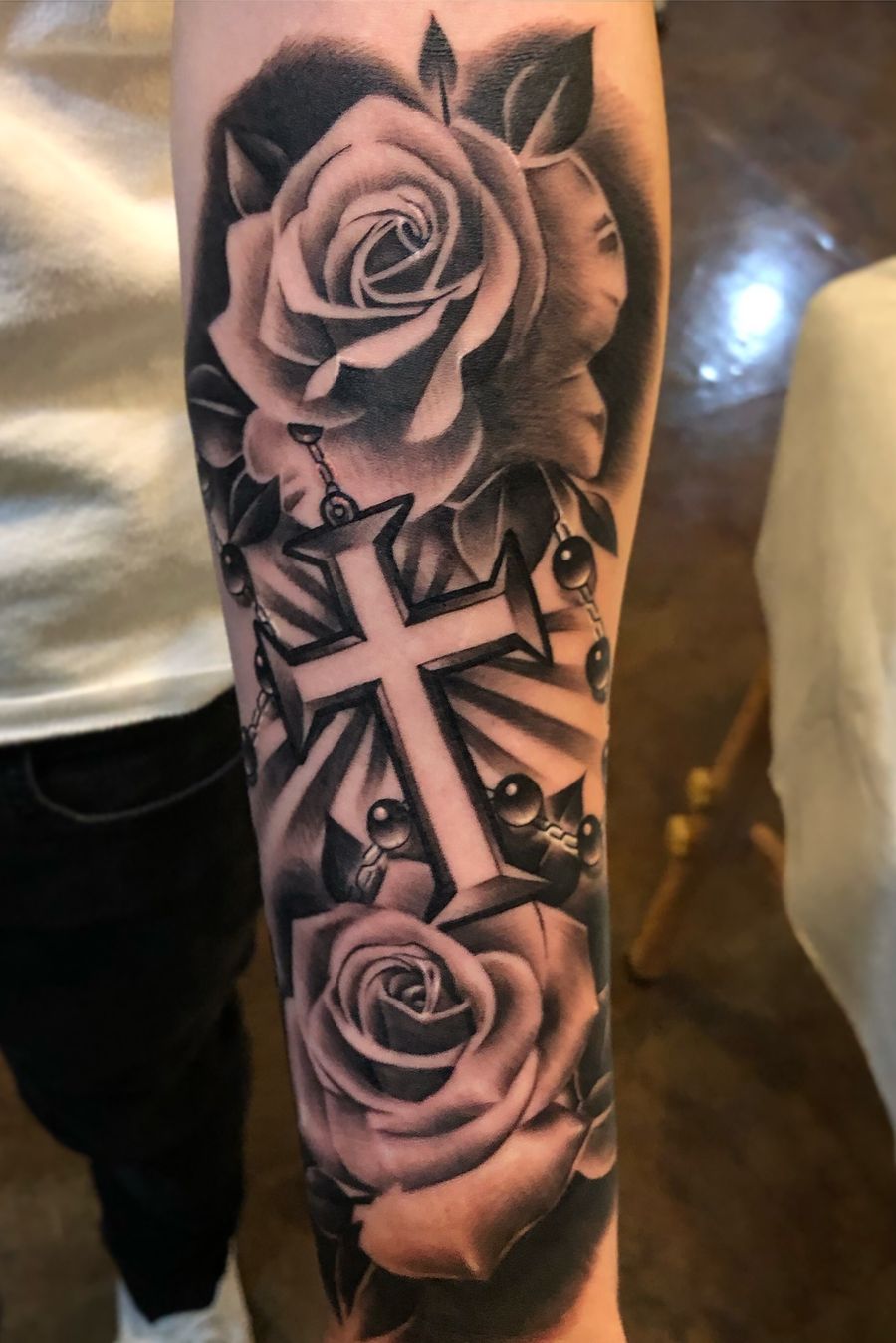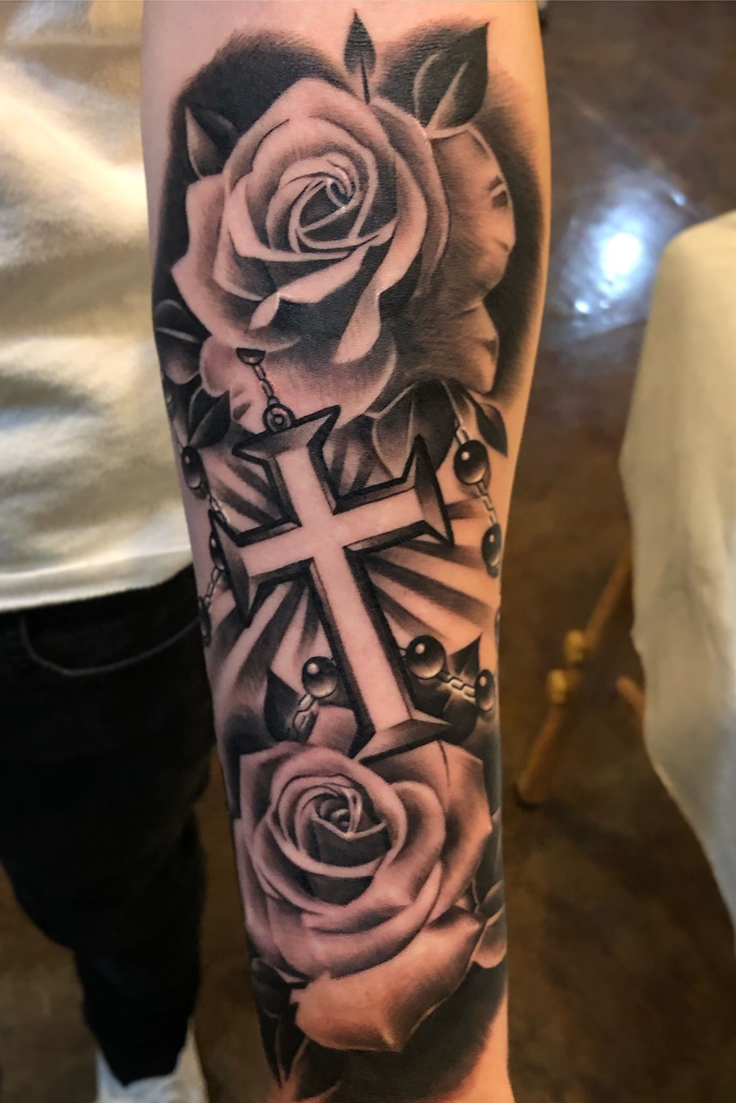 Black & Grey Roses + Cross by Jae at Tsunami Tattoo in Tacoma, WA.