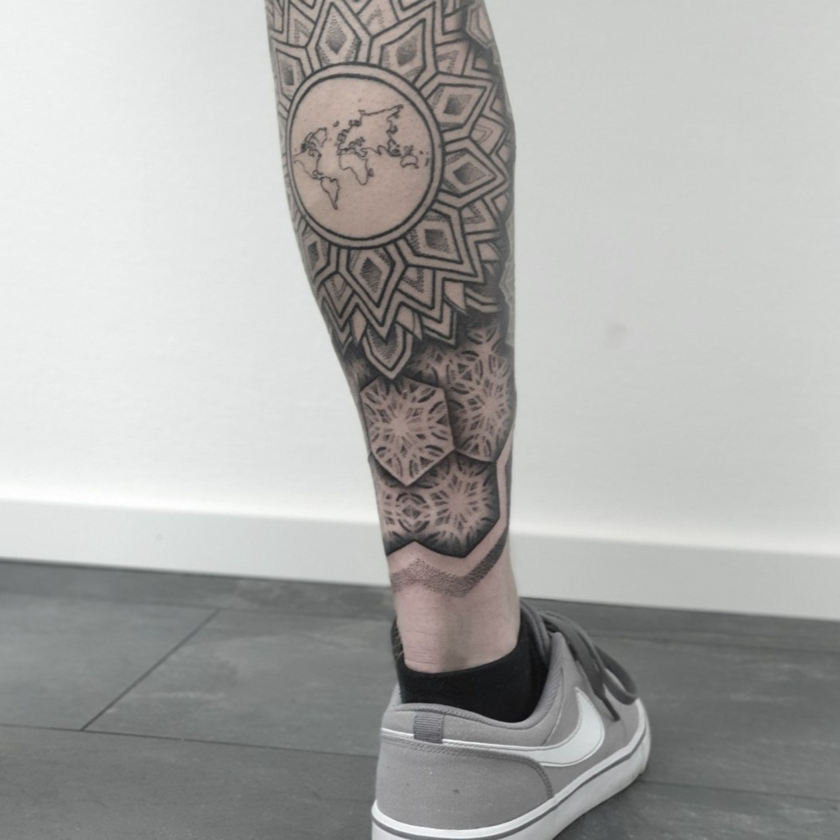 Full leg in progress. #wludarzdotworktattoo #dotworktattoo #dotwork #blackwork #herzbubetattoosupply #lithuanianirons #venomps2 #geometry #geometrictattoo #marchtrenk #mandalatattoo #ornamentaltattoo #ornament #dots #believatattoo #believa #geo