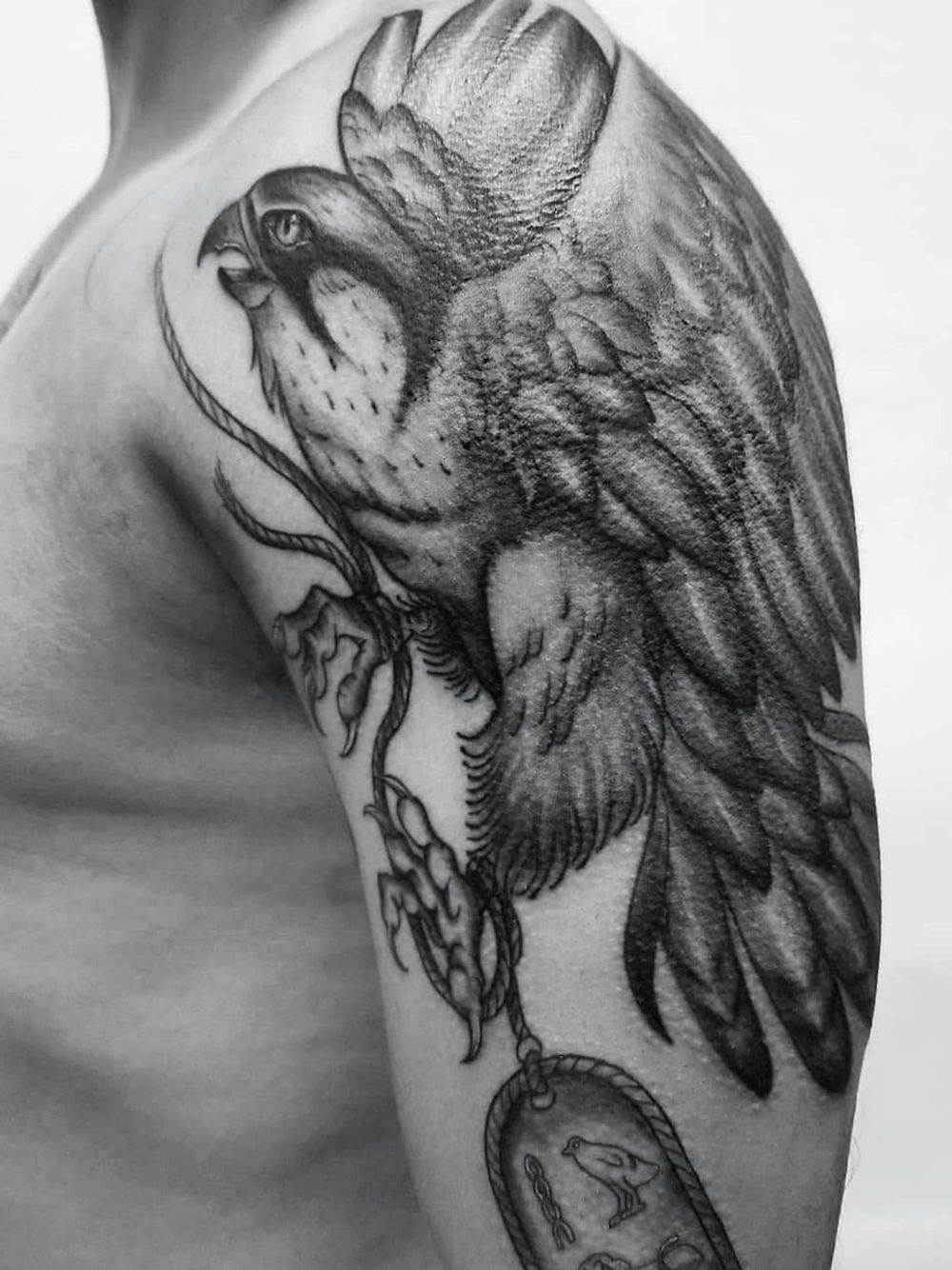 Falcon and cartoush #blackandgreytattoo #falcon #birdtattoos #halfsleeve #newyorktattoo