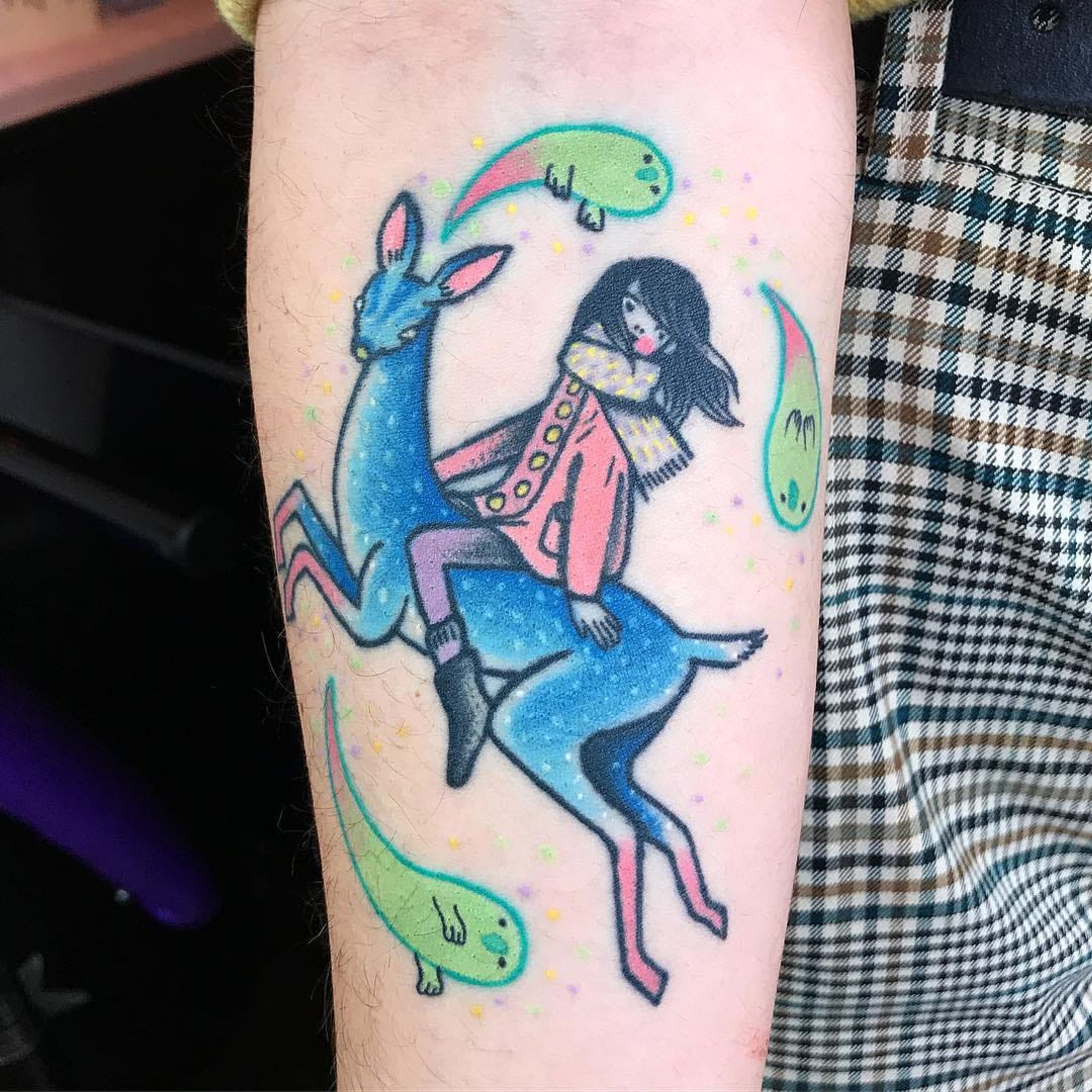 Tattoo by Robert WIlden aka Deathsure #RobertWilden #Deathsure #color #traditional #psychedelic #deer #ghost #girl #cute #animal #nature #anime #manga #illustrative