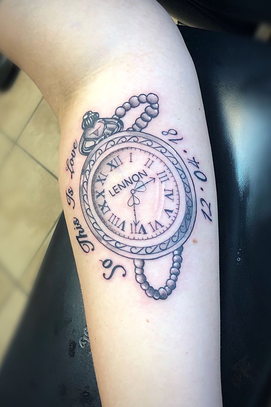 Tattoo i did on my sister, she just had a son named lennon so she got a pocket watch with his name and time of birth