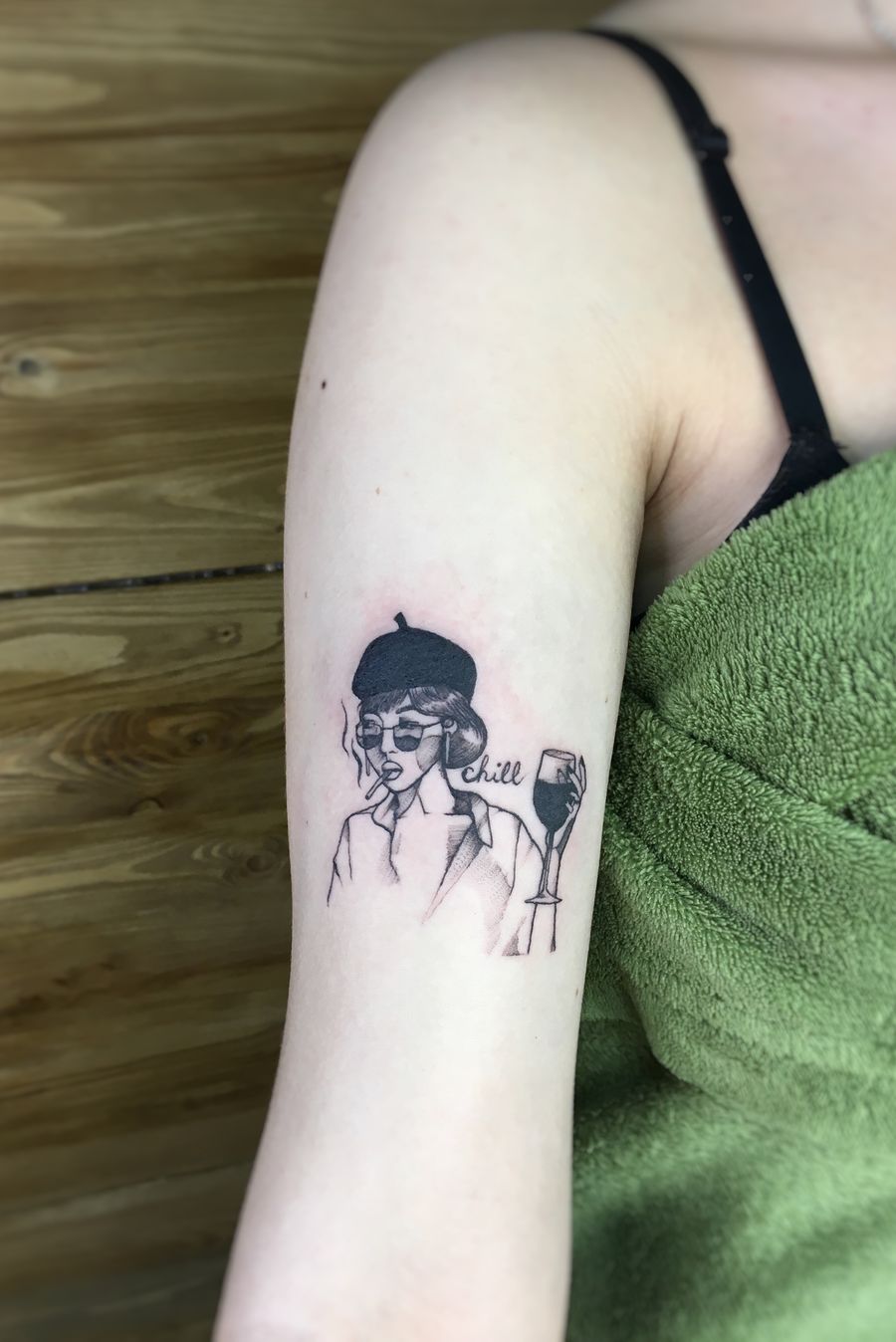 Chill #girlstattoo #wine #chill #kievtattoo #ukrainetattoo #linework