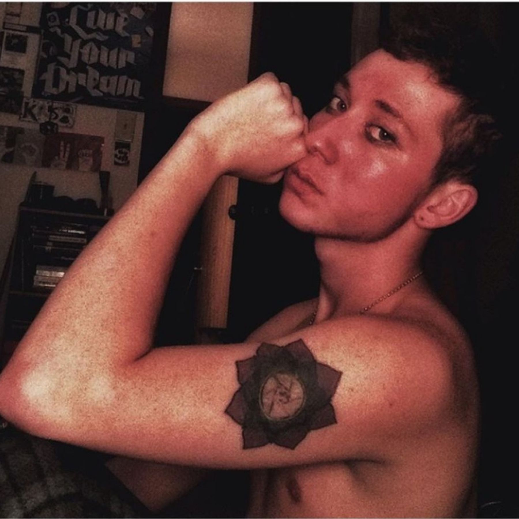 My first tattoo, a custom design I created in Photoshop my junior year at career technical school in Digital Media. It is a lotus flower with a camera shutter in the center. The lotus to me signifies hope, love, and new beginnings. The camera shutter is a symbol of my passion for photography. Eventually, I need it redone because the artist pressed too hard and I lost a lot of the ink.