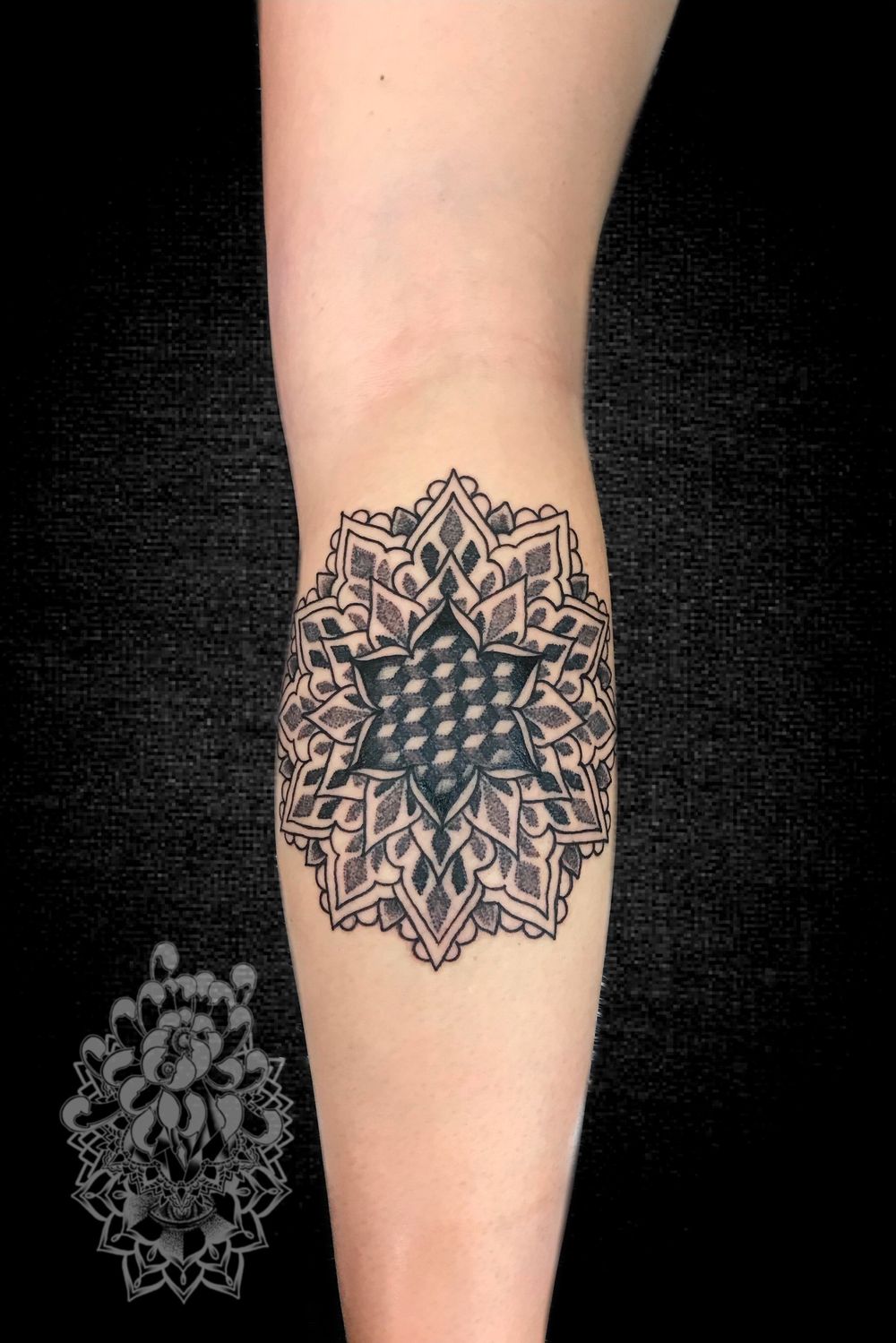 Blackwork calf mandala. #dotwork #blackwork #geometric #tattoo