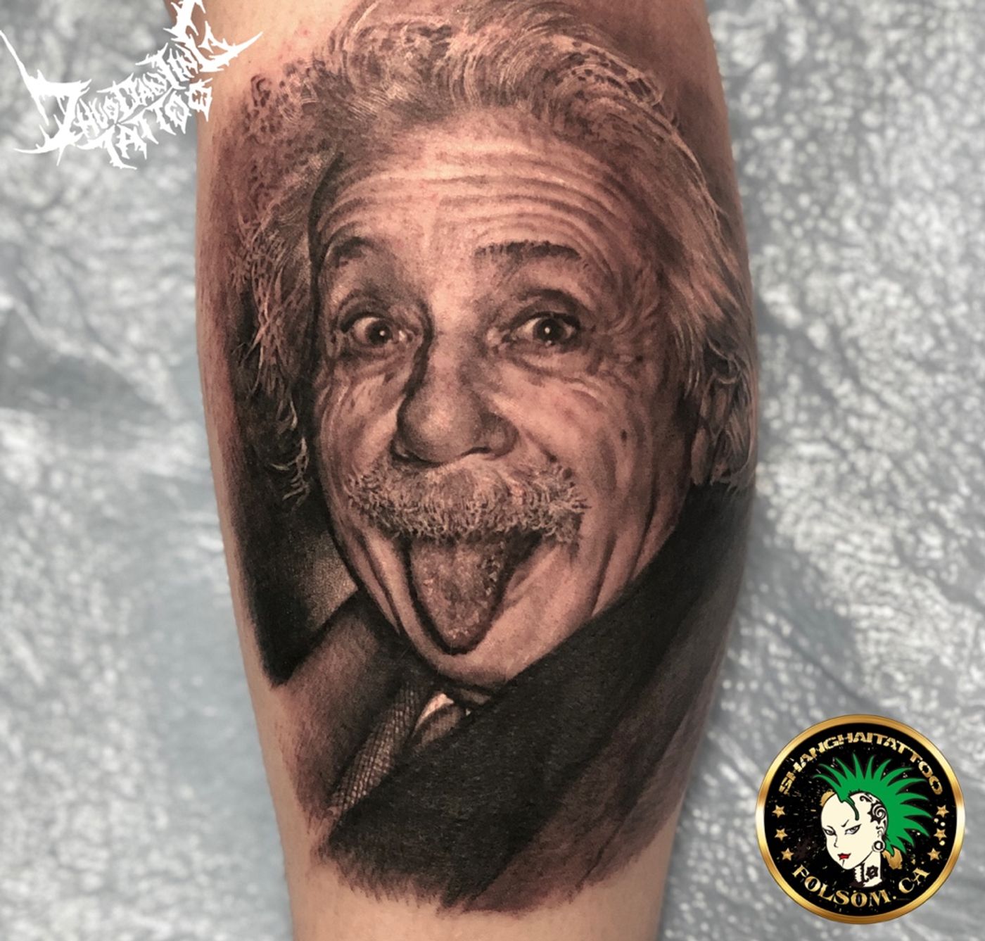 Albert Einstein portrait comleted these days at the new shop Ms Tings Shanghai Tattoo located in Folsom, California 😊 #shanghaitattoo #zhuodantingtattoo #portraittattoo #tattoorealistic #photorealism #blackandgrey #tattoodo