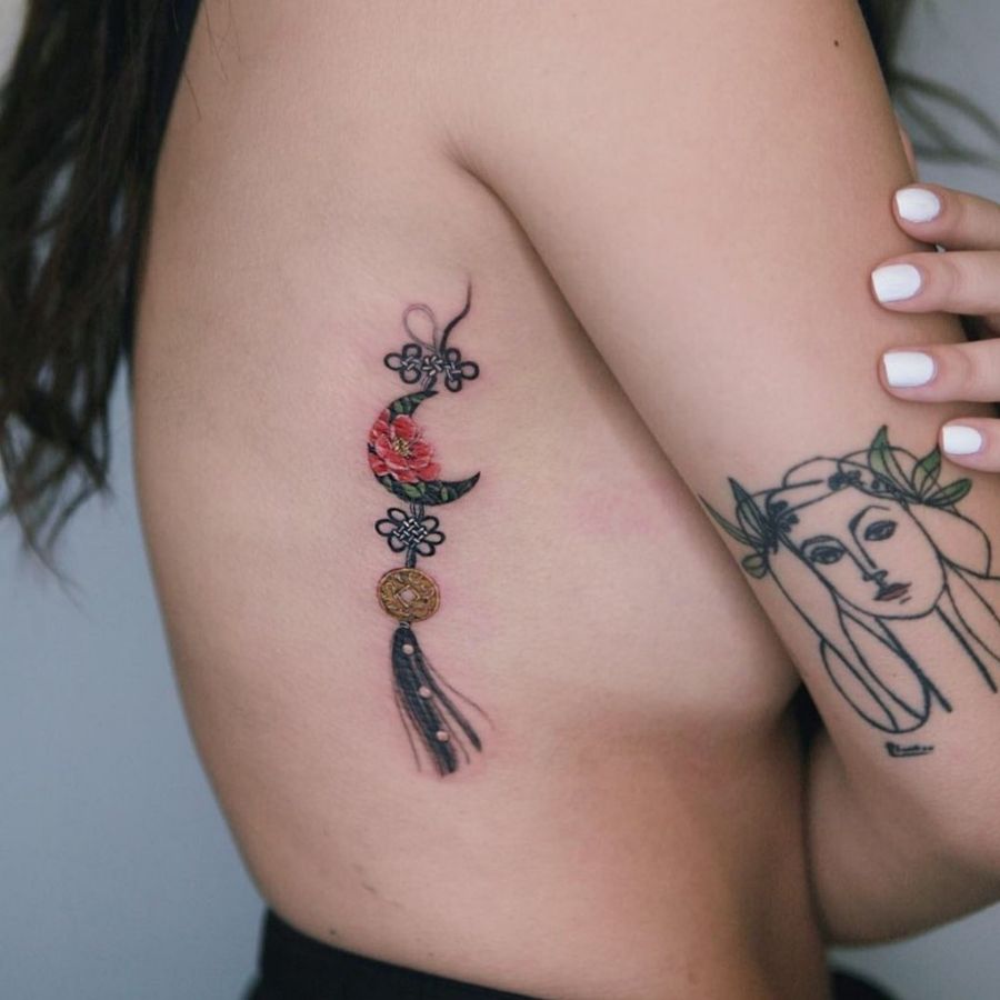 China rose inside a brooch with black moon norigae decorated with Chinese coin, done in Hong Kong.