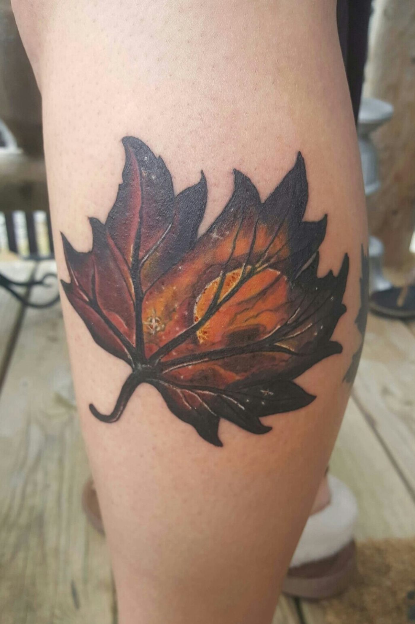 #turtlestyletattoocompany #virginia #tattooartist #tattooart #tattoo #tattoos #tattooed #leaf #customized #inkedup #bodyart #tattooedwomen #autumnleaves #colorful #sunset #sexy #cute #calf #womanwithtattoos #drbronners #valorrotary #freshink #inkeeze #kingpintattoosupply