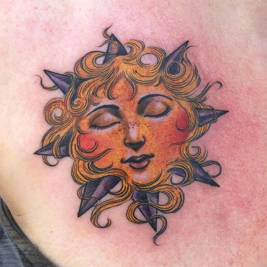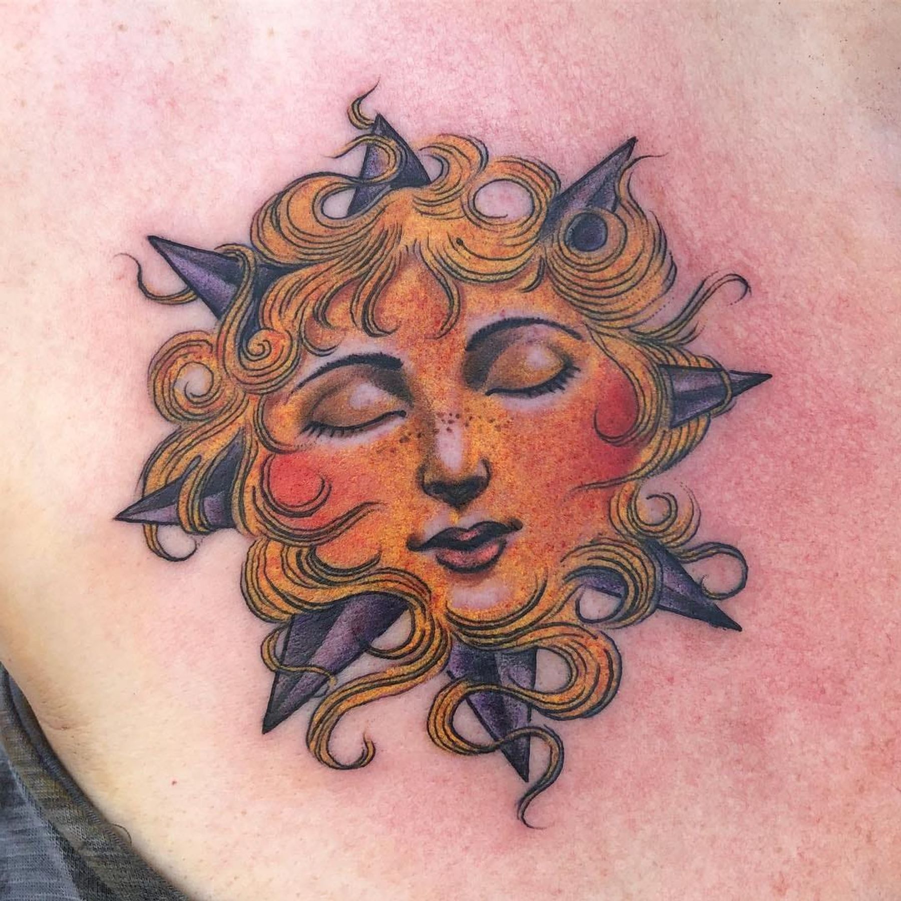Tattoo by Lara Scotton #LaraScotton #tattoodo #tattoodoapp #tattoodoappartists #besttattoos #awesometattoos #tattoosforgirls #tattoosformen #cooltattoos #color #sun #portrait #ladyhead #illustrative