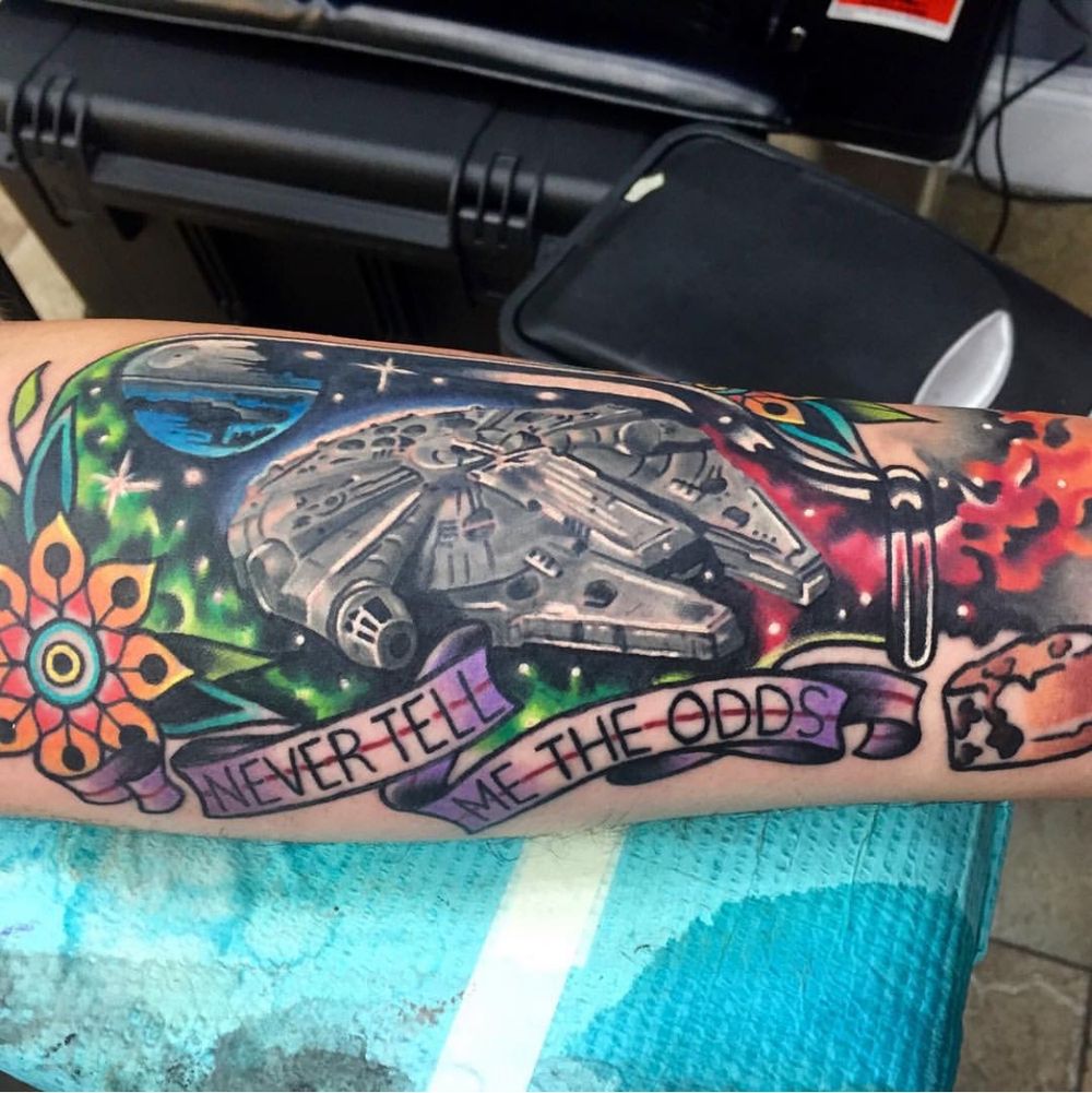 Heres a ship in a bottle tattoo I did using the millennium falcon from star wars. This tattoo was done on an inner forearm. #ship #starwars #color