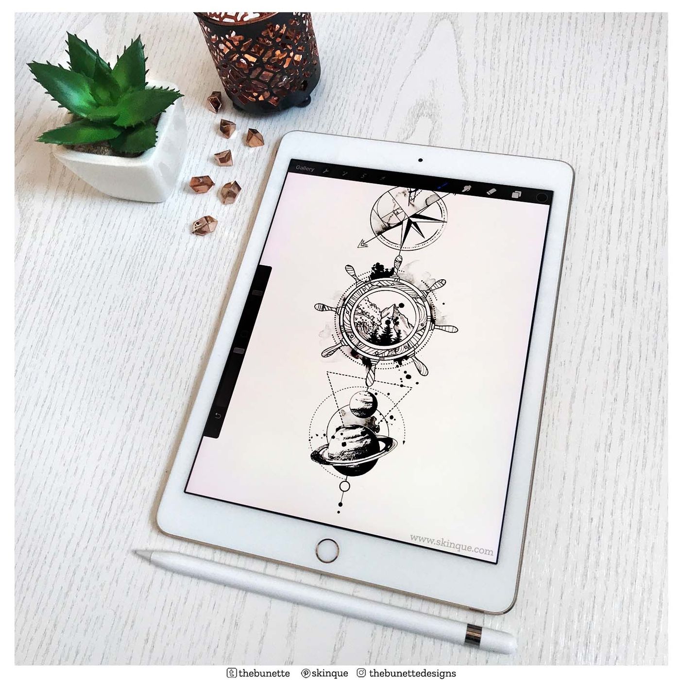 Travel the world✨ For commissions and for more designs www.skinque.com❤️ Follow me on instagram: @thebunettedesigns or Tumblr: thebunette.tumblr.com #compass #trashpolka #trashpolka #trash #planet #abstract #travel #traveltattoos #forearm #backpiece #backtattoo #sidetattoo #thigh #thigh #geometric #geometrictattoo #geometry #nature #traveltattoos #anchor #mountain #mountains #illustration #compasstattoo #universe