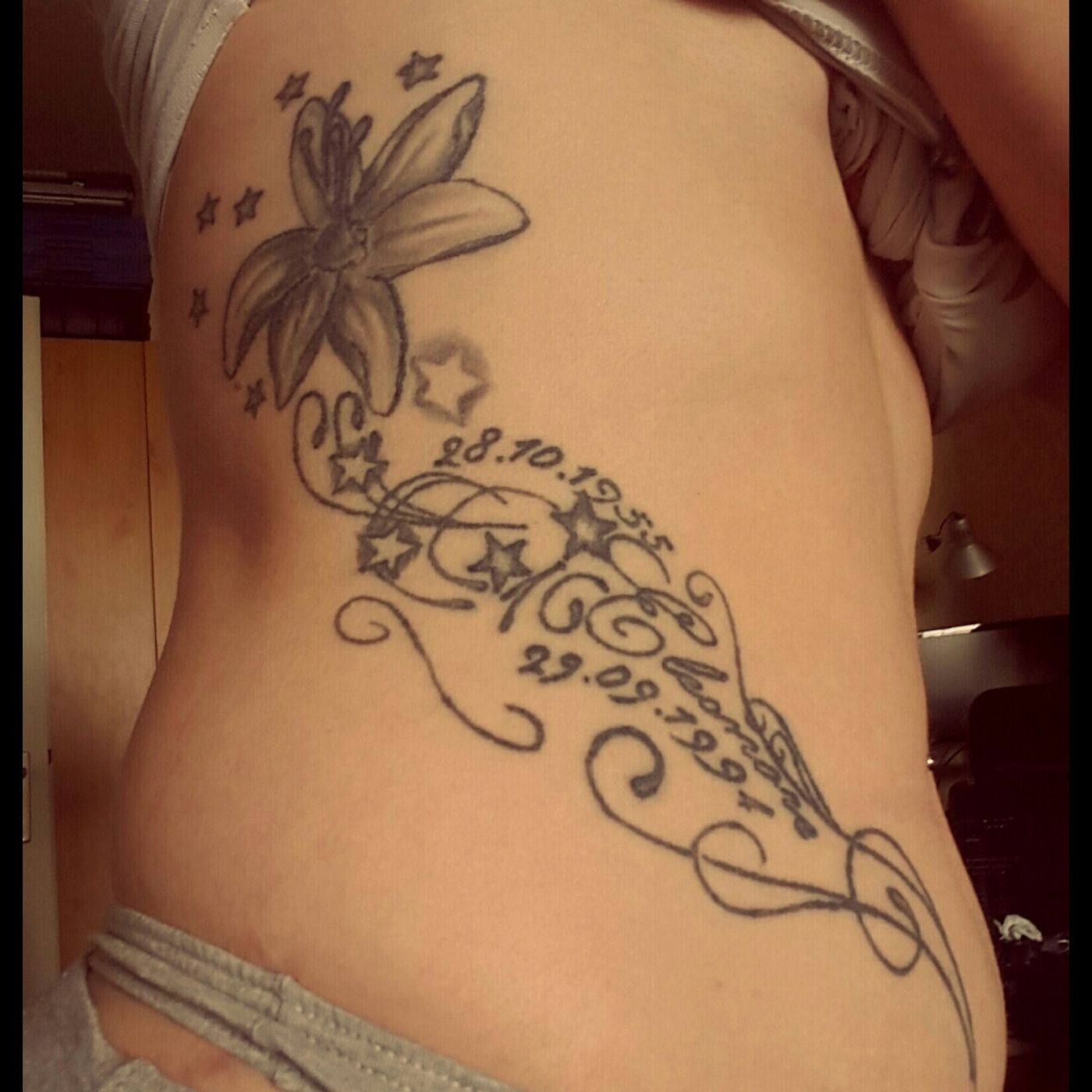 In memory of my Mom, the date she was born... The date she left and her name on my ride side