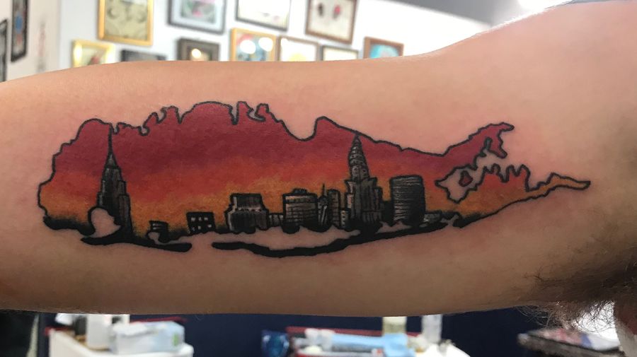 First time doing a skyline, *Long Island Skyline*. #solidink #meekBtattoos #sandiego #california #trad #traditional #traditionaltattoo #color #BoldTattoos #life ##hivecaps #fkirons #neotraditional #neotraditionaltattoo #skyline #longislandtattoo #usa #sunset #newyork #newyorkstate #ny