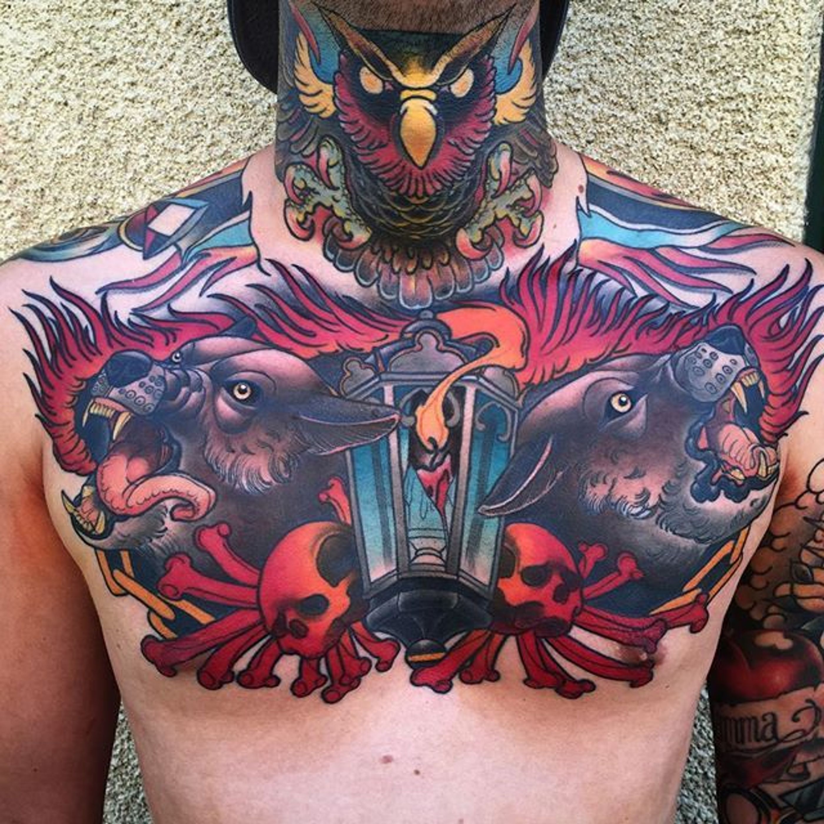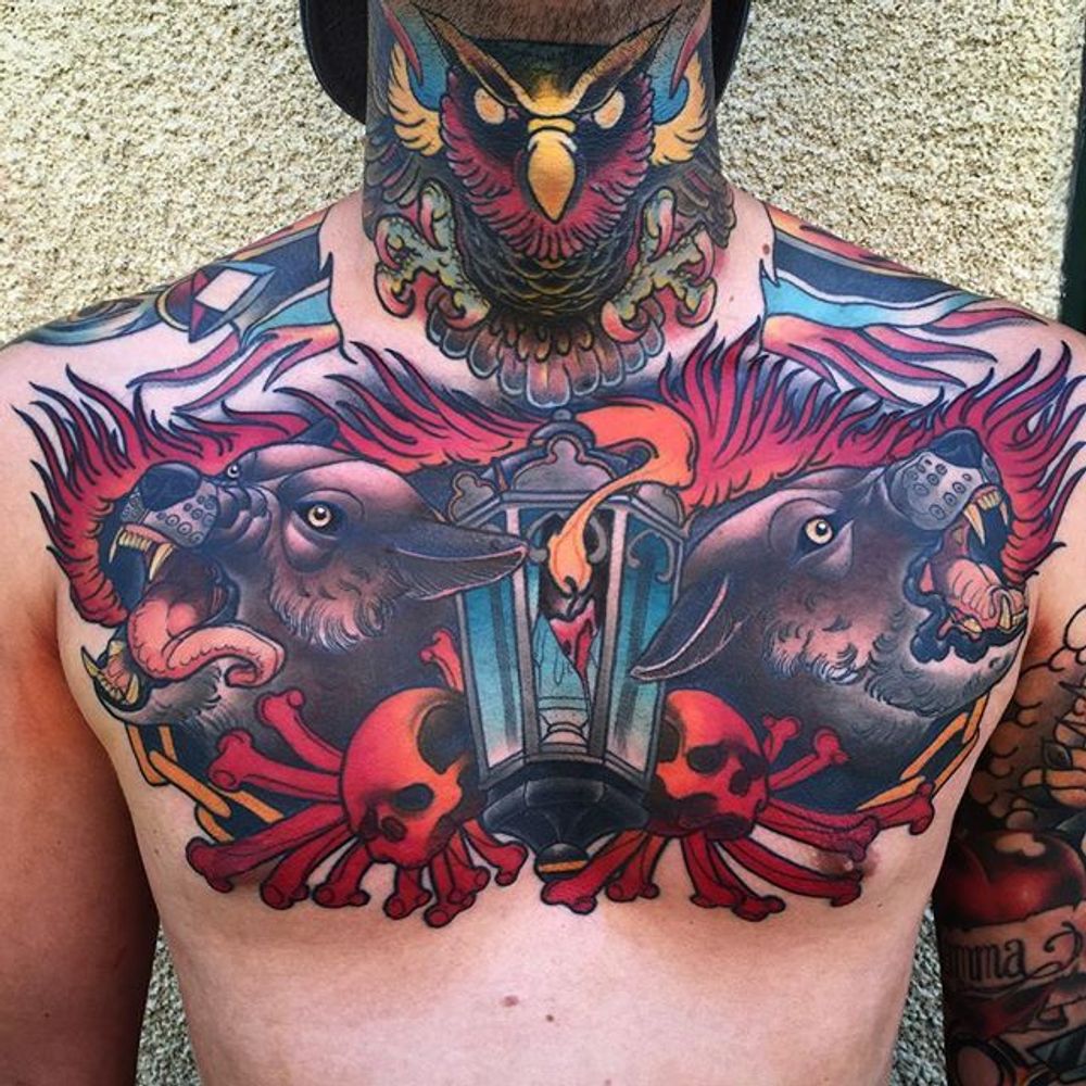 Wolf Chestpiece Tattoo by Jacob Wiman #NeoTraditional #NeoTraditionalTattoos #NeoTraditionalArtist #Wolf #chestpiece #BoldTattoos #JacobWiman