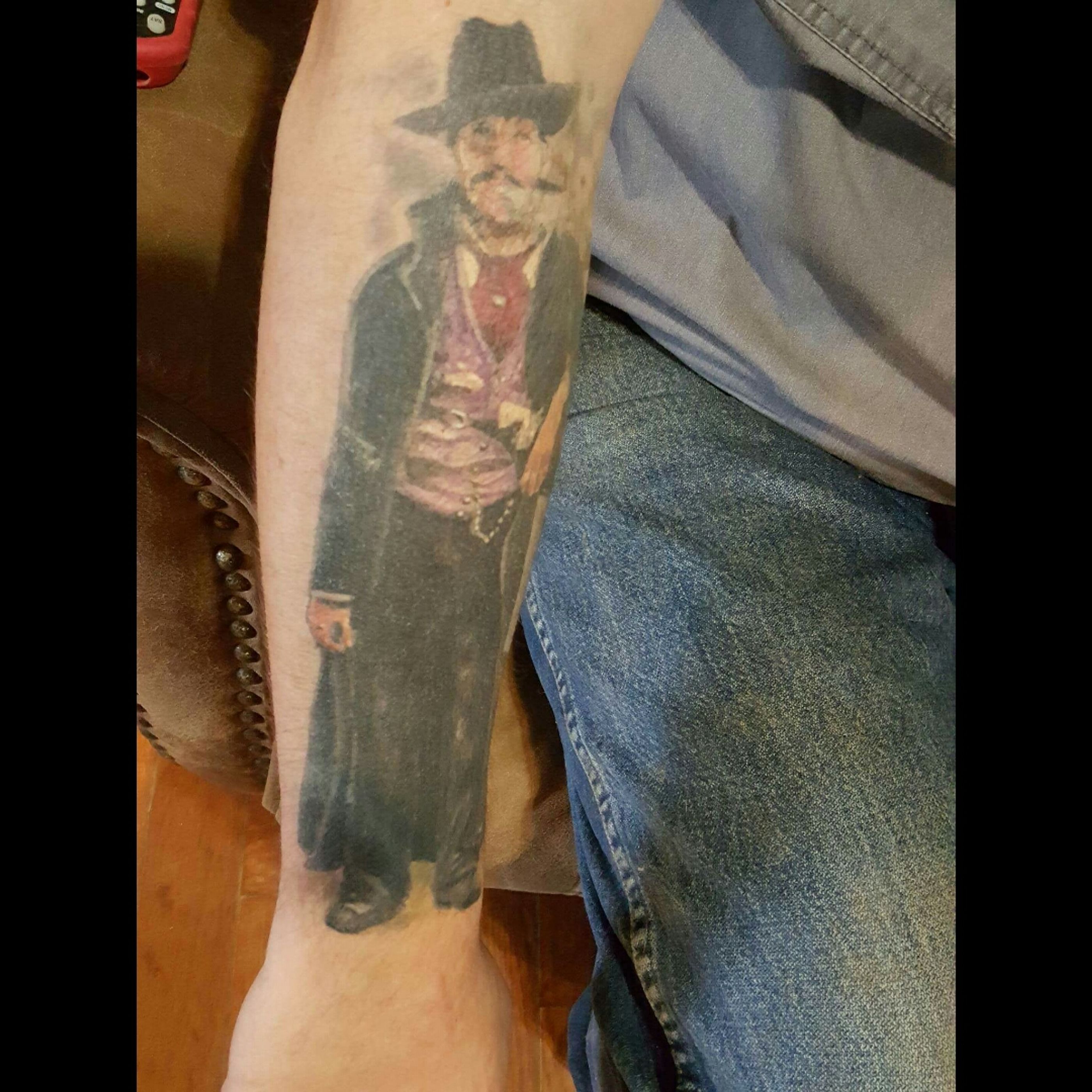 Val Kilmer as Doc Holiday from Tombstone I have this on top of my right forearm. I would like to finish my arm out as a sleeve. On the upper part of my arm I have a Maltese firefighting cross. Anyone have any suggestions or thoughts as how I could accomplish a sleeve on this arm?