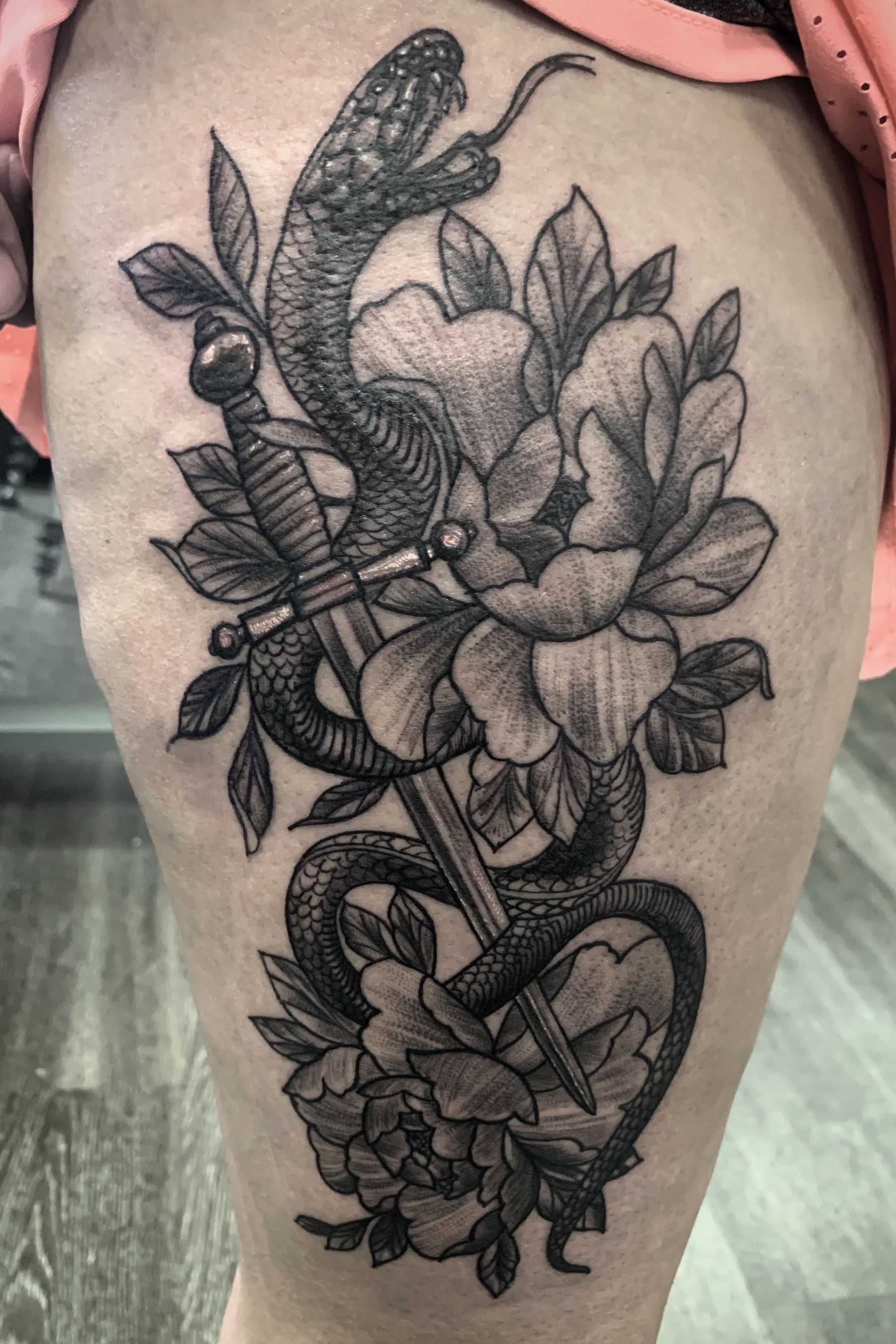Superfund snake dagger Peony flower tattoo I completed the other day