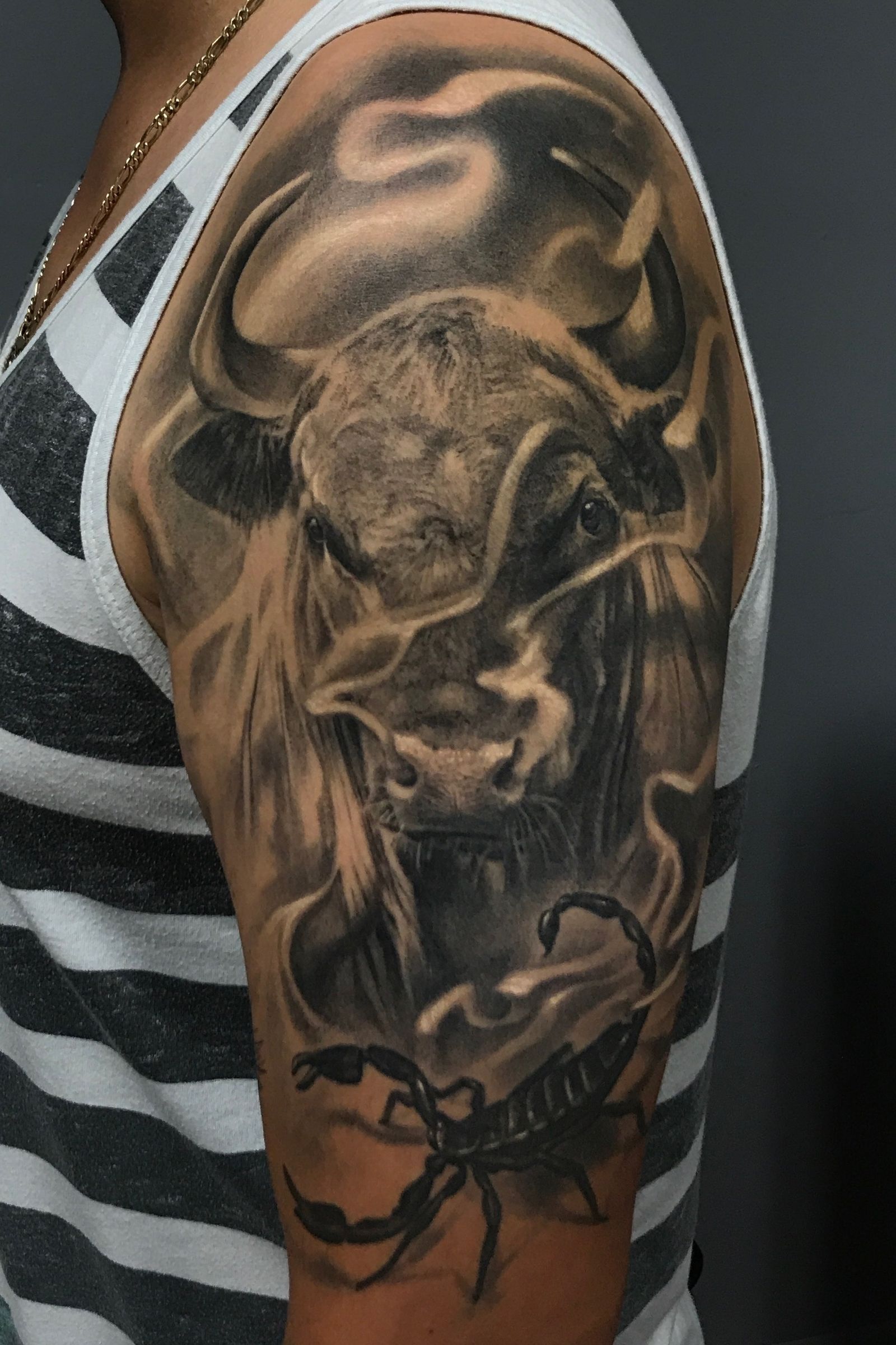 #healed #blackandgrey #realism #animal #halfsleeve #bull #scorpion #taurus #scorpio #smoke