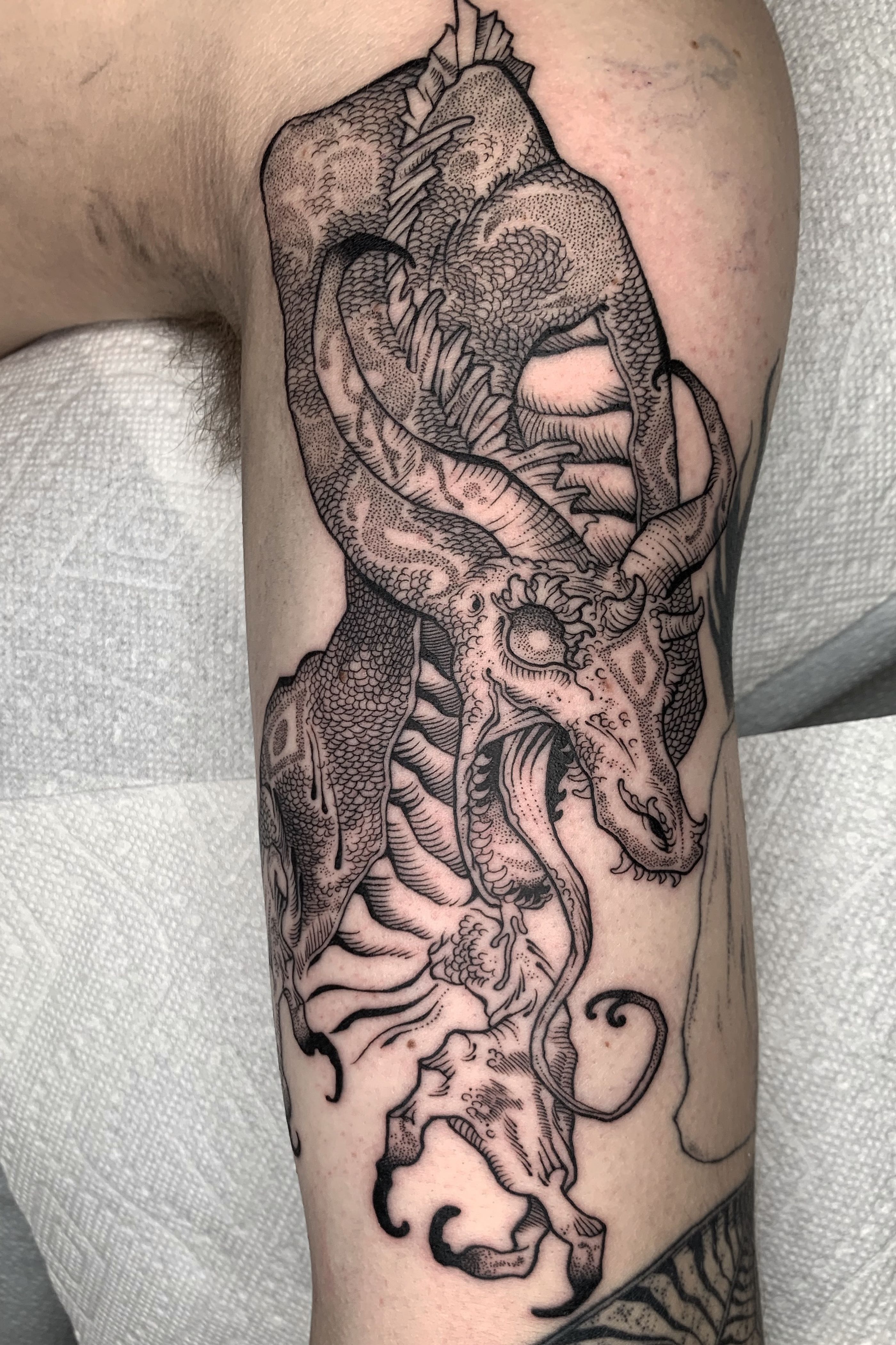 “Thus they beheld Tiamat; unrivaled ruler of all the sanctuaries.” Thanks for sitting tough, Sky. #blackwork #blackworktattoo #darkartists #tttism #ttmmt #columbustattooers #ohiotattooers #dragontattoo #blacktattoo