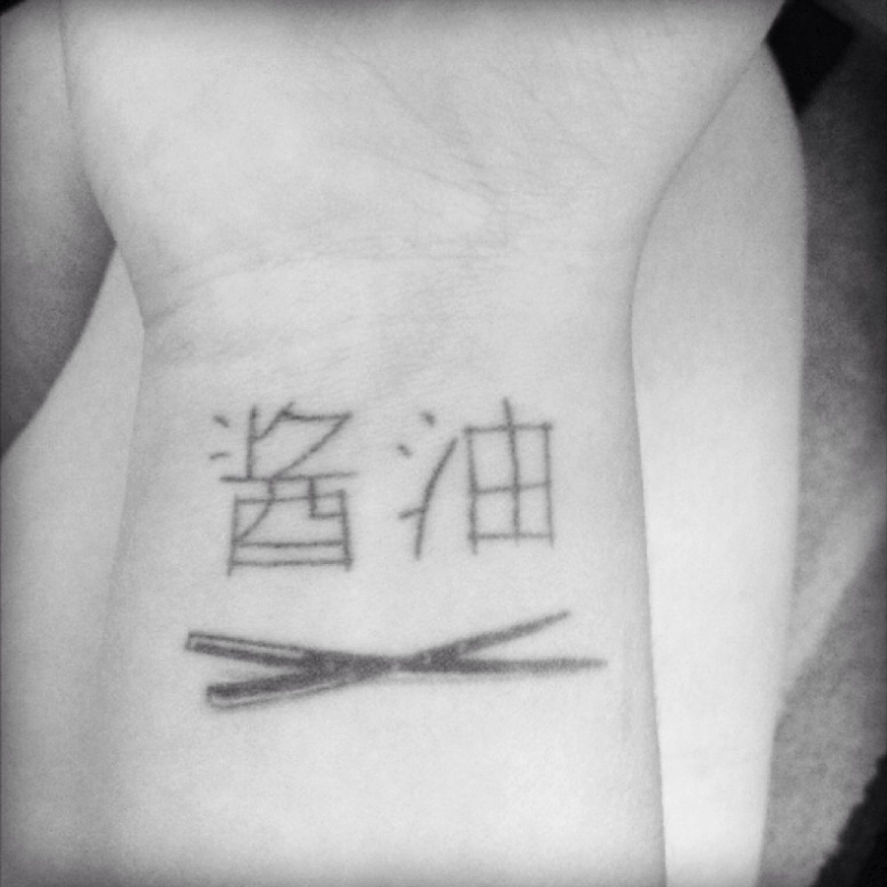 Soy sauce in chinese writing with chop sticks on my wrist!