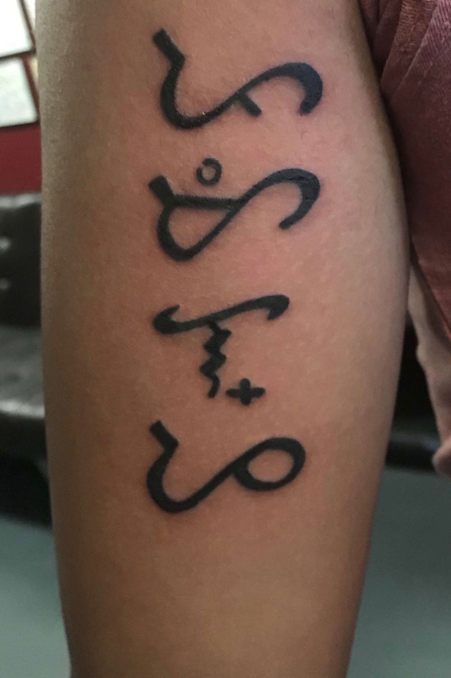Filipino Baybayin tricep tattoo. “Pamilya” #Filipino #baybayin #baybayintattoo #pamilya #alibata #alibatatattoo