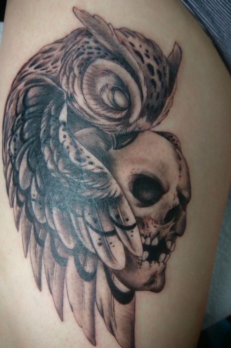 Owl and skull Tattoo Cover, done Whit kaco Tattoo machine. Entre Lagos Tattoo & Art Gallery Centralstrasse 42 Interlaken WhatsApp :079 448 35 83 Facebook :jairo ramirez art Instagram :JAIRO_RAMIREZART Www.entrelagostattooartgallery.com Jairoramirezart@gmail.com