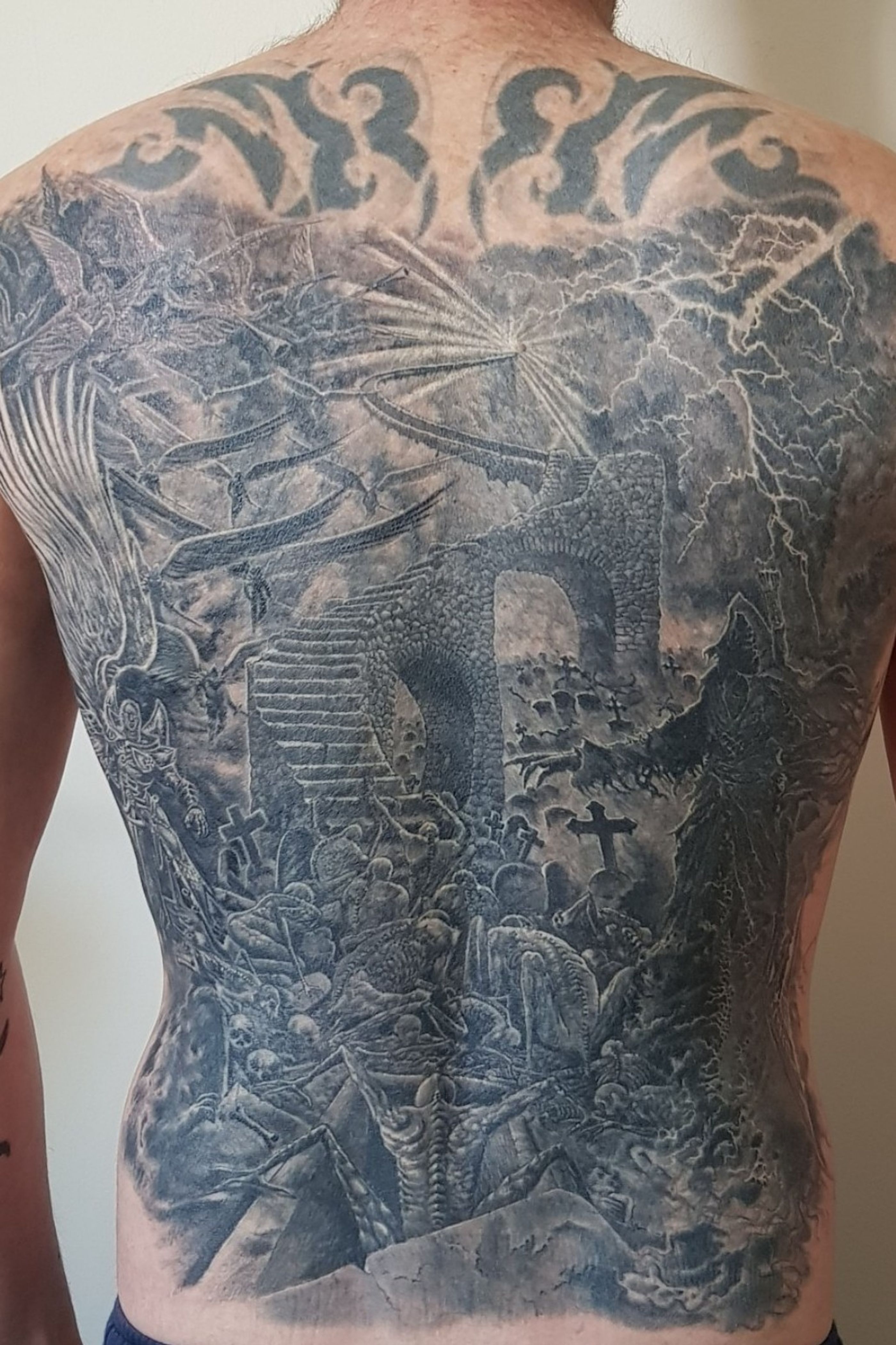 Heaven vs Hell black and grey full back coverup