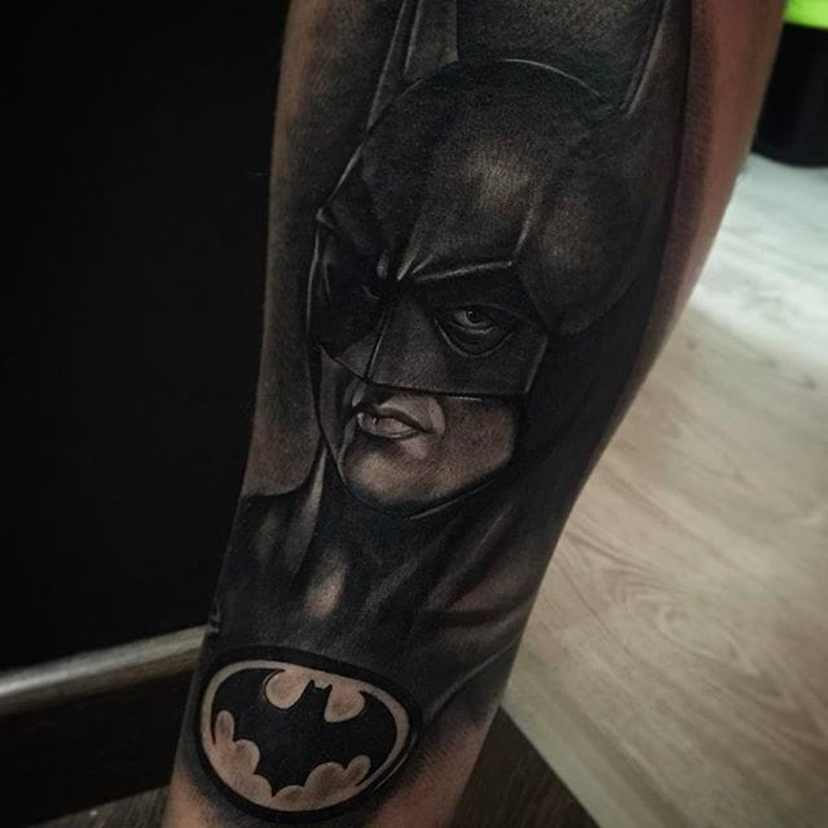 Insane looking Michael Keaton portrait as Batman. Tattoo by Juande Gambin. #juandegambin #portraittattoos #batman