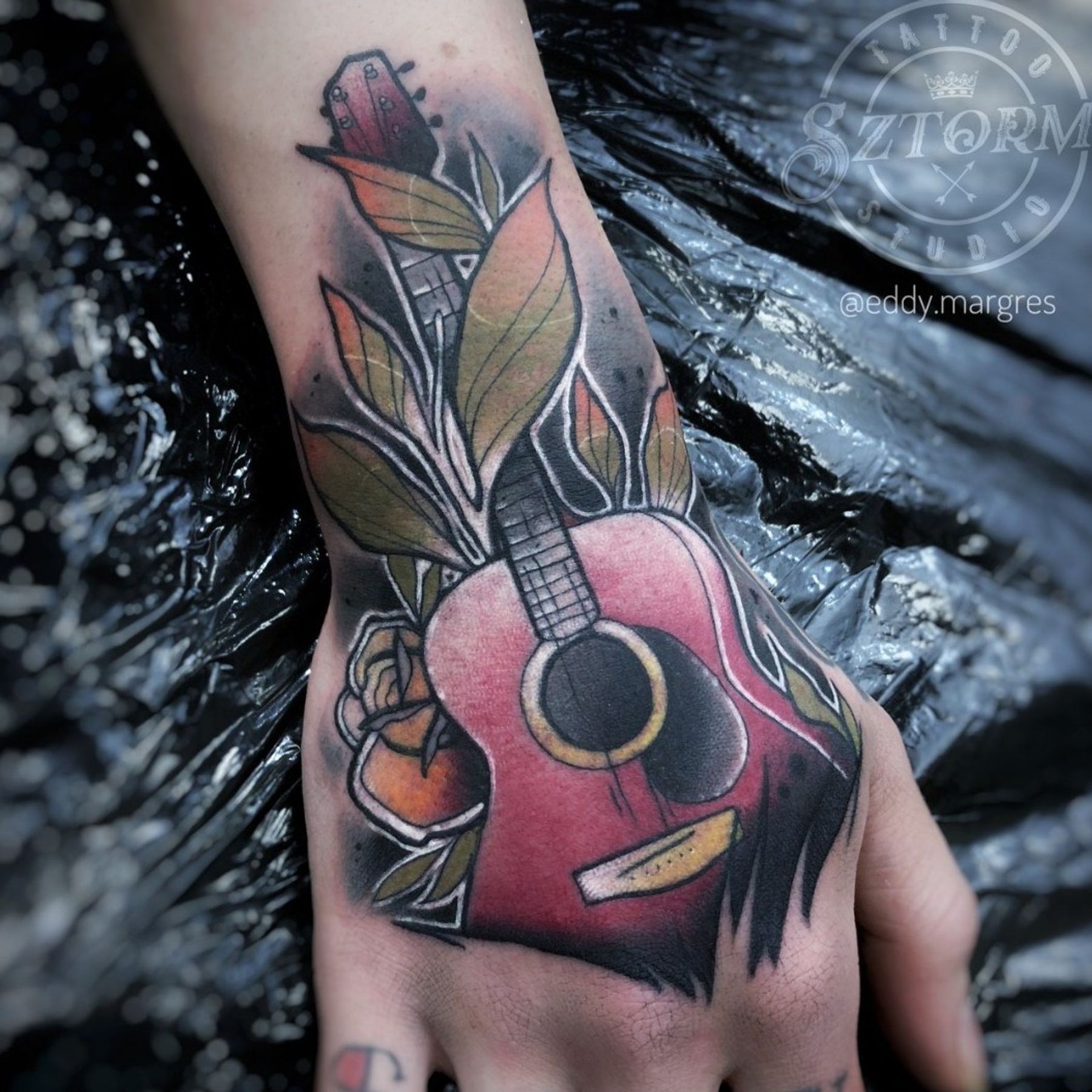 Guitar with green #neotrad #neotraditional #neotraditionalartist #guitartattoo #guitarra #guitar #gdansk #poland #polska