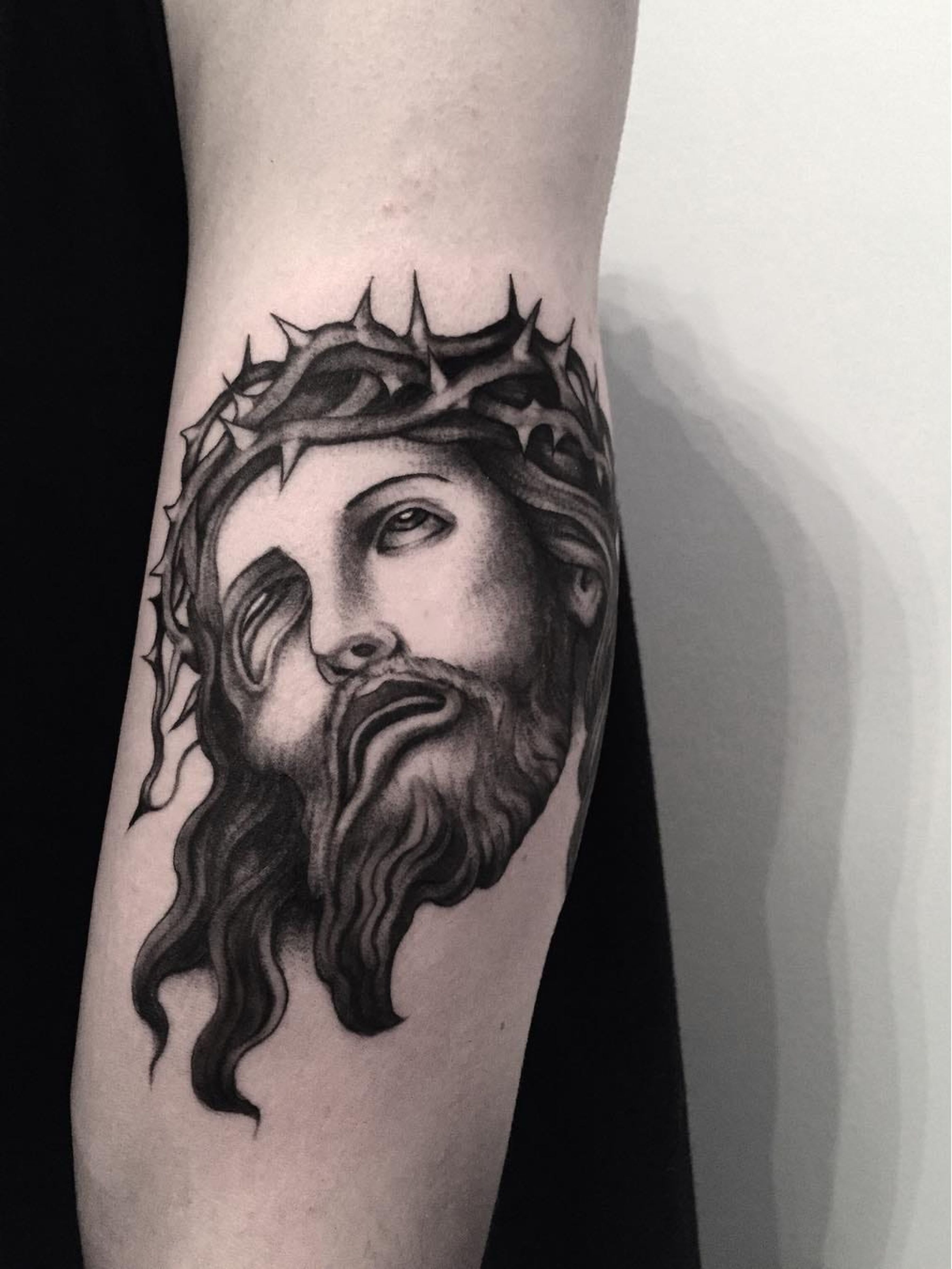 Jesus tattoo by Adam Vu Noir #AdamVuNoir #Jesustattoo #JesusChristtattoo #religioustattoo #religious #Catholic #Christian #portraittattoo #crownofthorns #surreal #warped