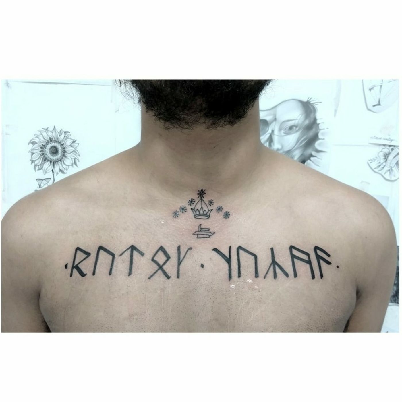 Tatuagem com temática ligada ao universo Senhor dos Anéis, tratando de aspectos da cultura dos Anões.