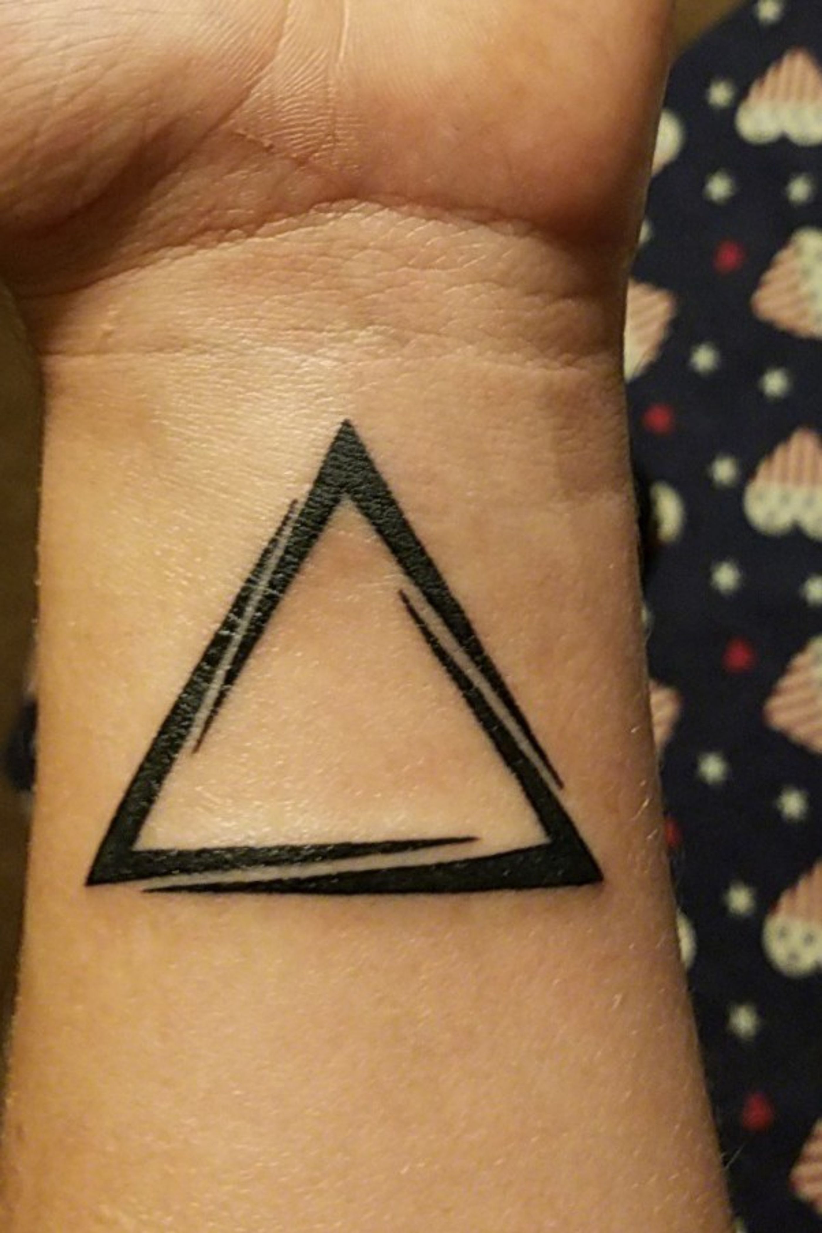My very first tattoo. Nice simple triangle with a hell of a meaning to me. Birth, growth and death. An infinite loop of these three steps of life, hence the triangle.
