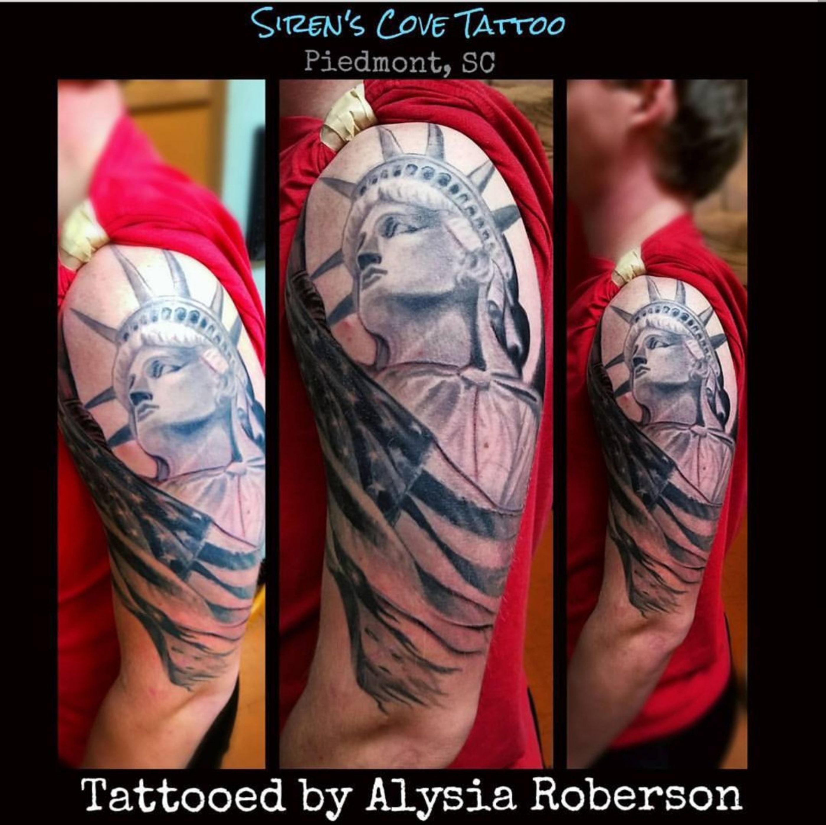Finished this patriotic halfsleeve on former Army soldier, tattooed by Alysia Roberson at Siren's Cove Tattoo in Piedmont, SC!!! Everything is healed except her arm coming up close to his chest, and a little black on the back side of the arm pretty much! #patriotic #tattoos #merica #Americanflagtattoo #American #USA #Army #military #Armytattoo #militarytattoo #soldier #soldiertattoo #statueofliberty #statueoflibertytattoo #Americanflag #flagtattoo #realistictattoo #tattoos #tattooed #tattooedmen #tattooedman #tattooedwoman #tattooedwomen #halfsleevetattoo #halfsleeve #blackandgreytattoo #sctattooist #sctattoo #sctattooshop #southcarolinatattooartist #americafuckyeah #downtowngreenville #greenvillesc #andersonsc #clemsonsc #alysiarobersontattoo #sirenscovetattoo www.facebook.com/sirenscovetattoo