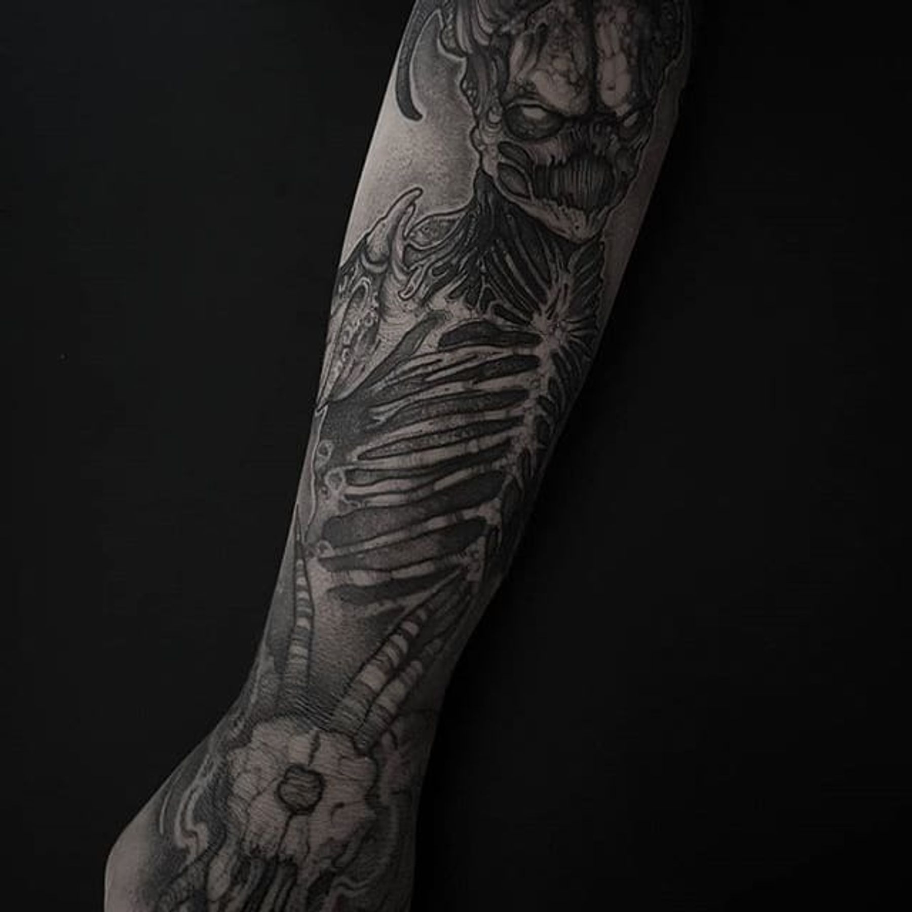 Blackwork tattoo by Felipe Kross. #FelipeKross #blackwork #dotwork #demon #creature