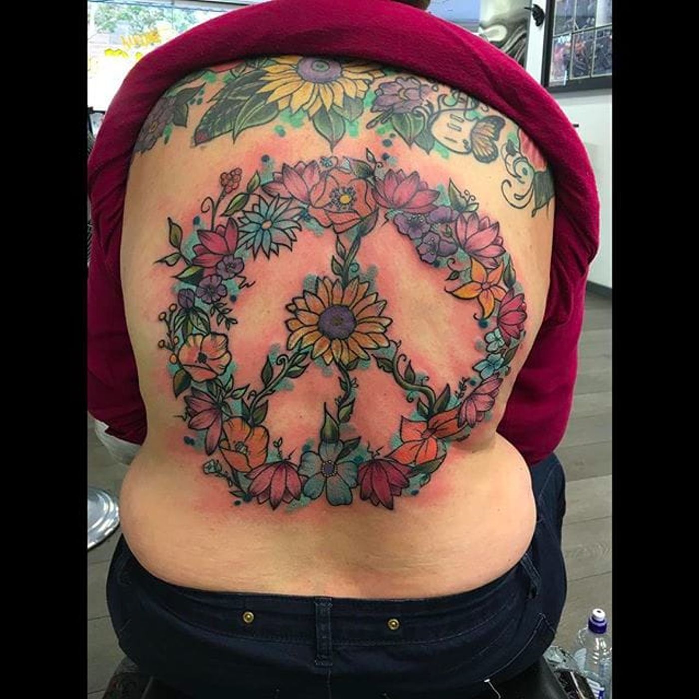 Huge Peace Sign Back Tattoo by @libbyguytattoos #LibbyGuyTattoos #Peace #PeaceSign #PeaceSignTattoo