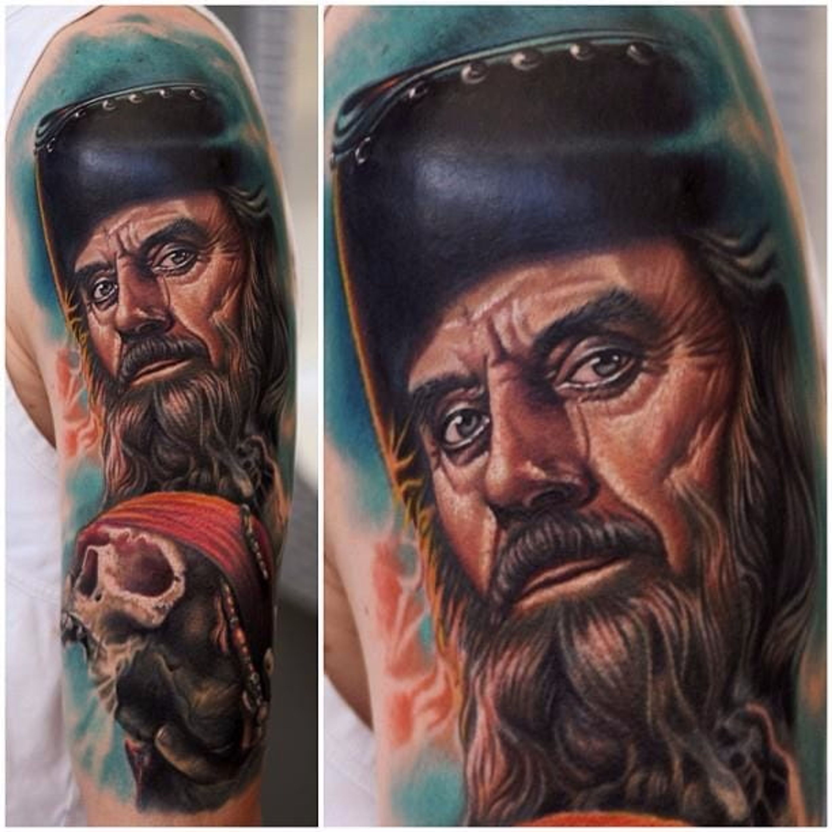 Blackbeard Tattoo by Nikko Hurtado #Blackbeard #PiratesoftheCaribbean #PiratesoftheCarribeanTattoo #PirateTattoos #DisneyTattoos #MovieTattoos #NikkoHurtado